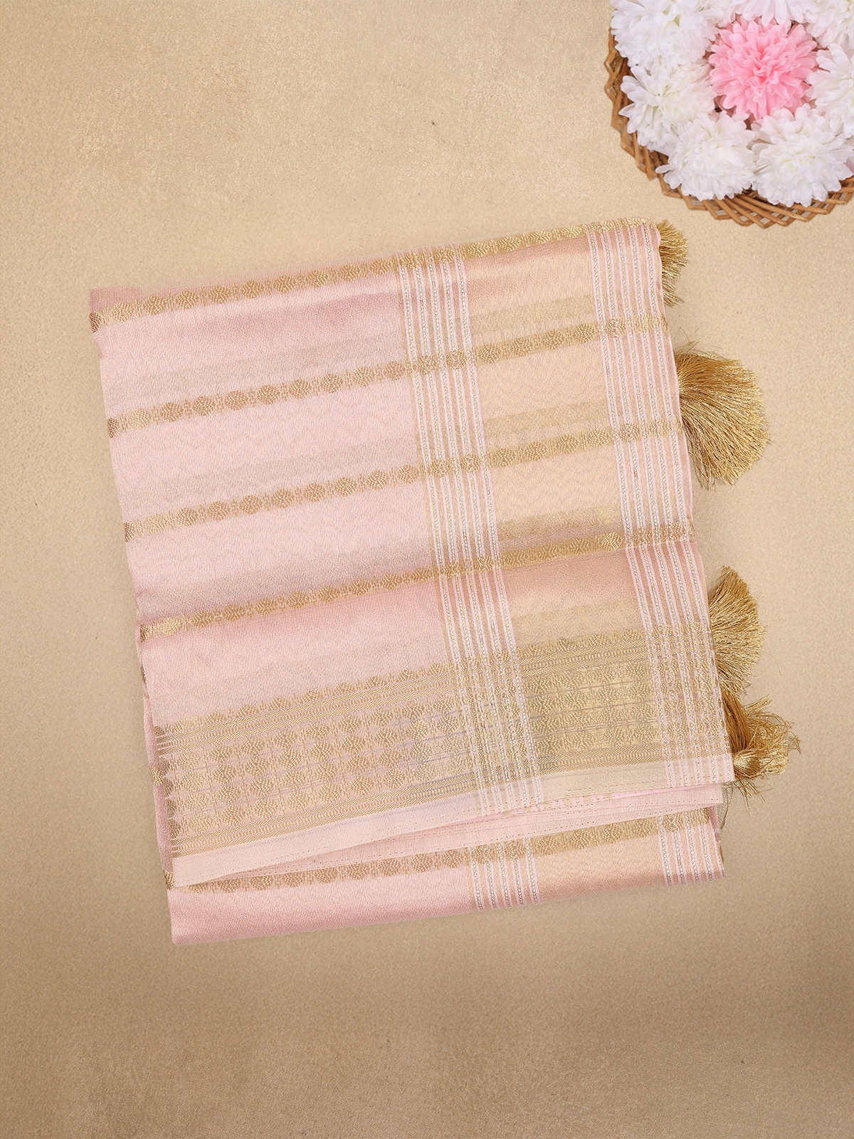 Grace your festive moments with the soft charm of this pastel pink Stripes woven tissue saree. The saree features a subtle Stripes pattern enhanced with shimmering golden zari details that add a refined touch of luxury. The elegant golden zari border and beautifully tasseled pallu elevate the drape, creating a stunning blend of simplicity and richness.