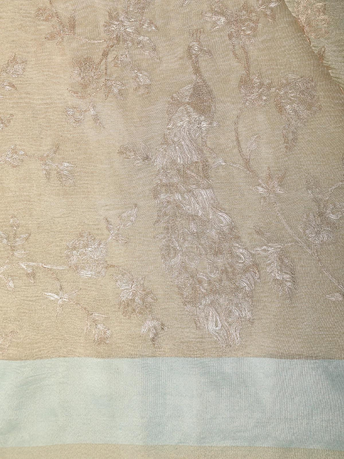 Delicate floral motifs woven and embroidered along the saree add a graceful charm, making it perfect for both daytime and evening celebrations. The pastel shade of sage green paired with a smooth, lustrous border brings a refined, polished finish to the look.