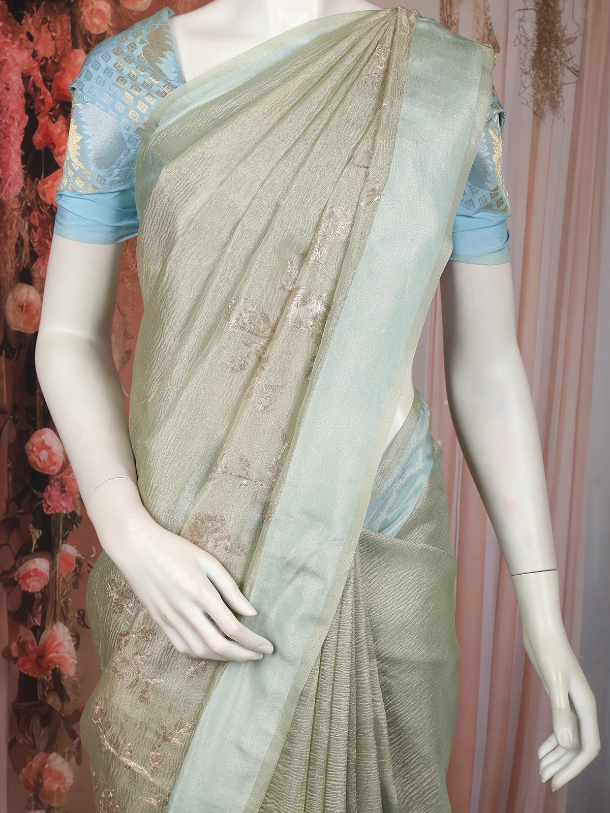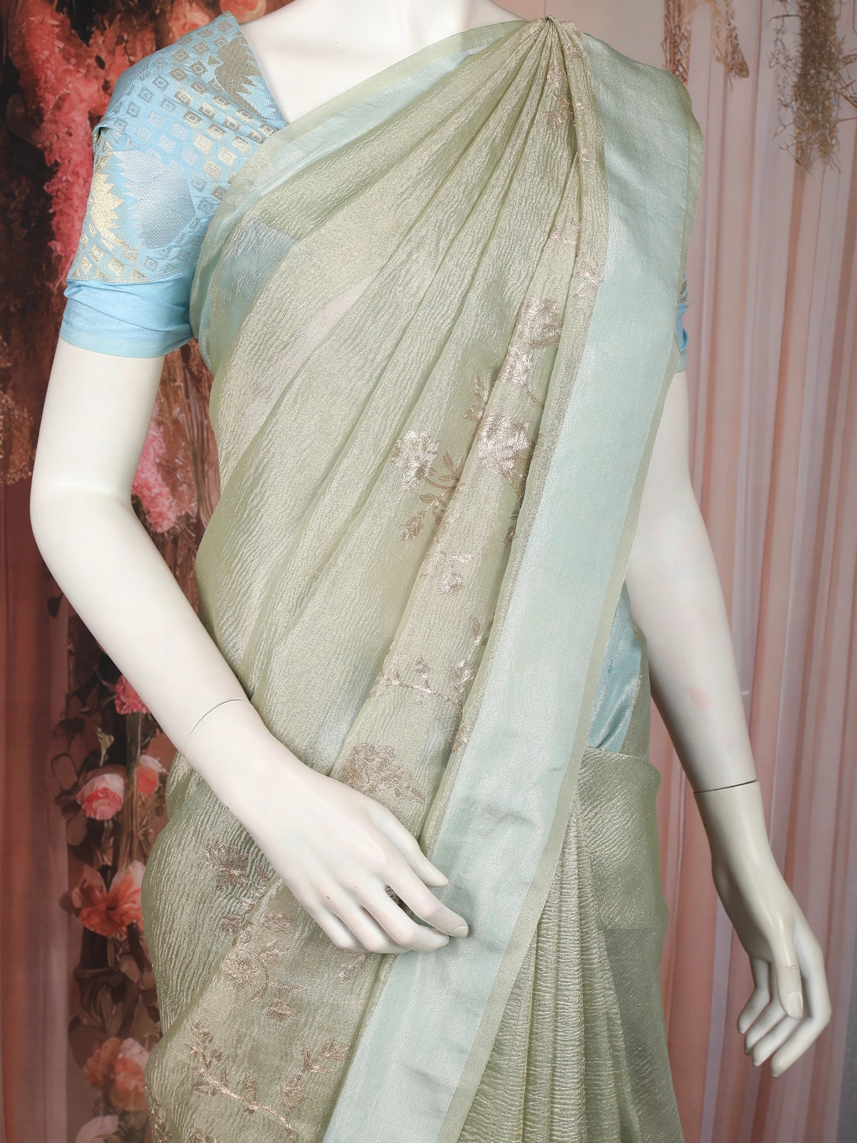 Step into effortless elegance with this Pastel Sage Green Tissue Saree, designed for women who love subtle sophistication with a touch of shimmer. Crafted from premium tissue fabric, the saree features a soft, airy drape with a gentle metallic sheen that beautifully enhances its pastel tone.