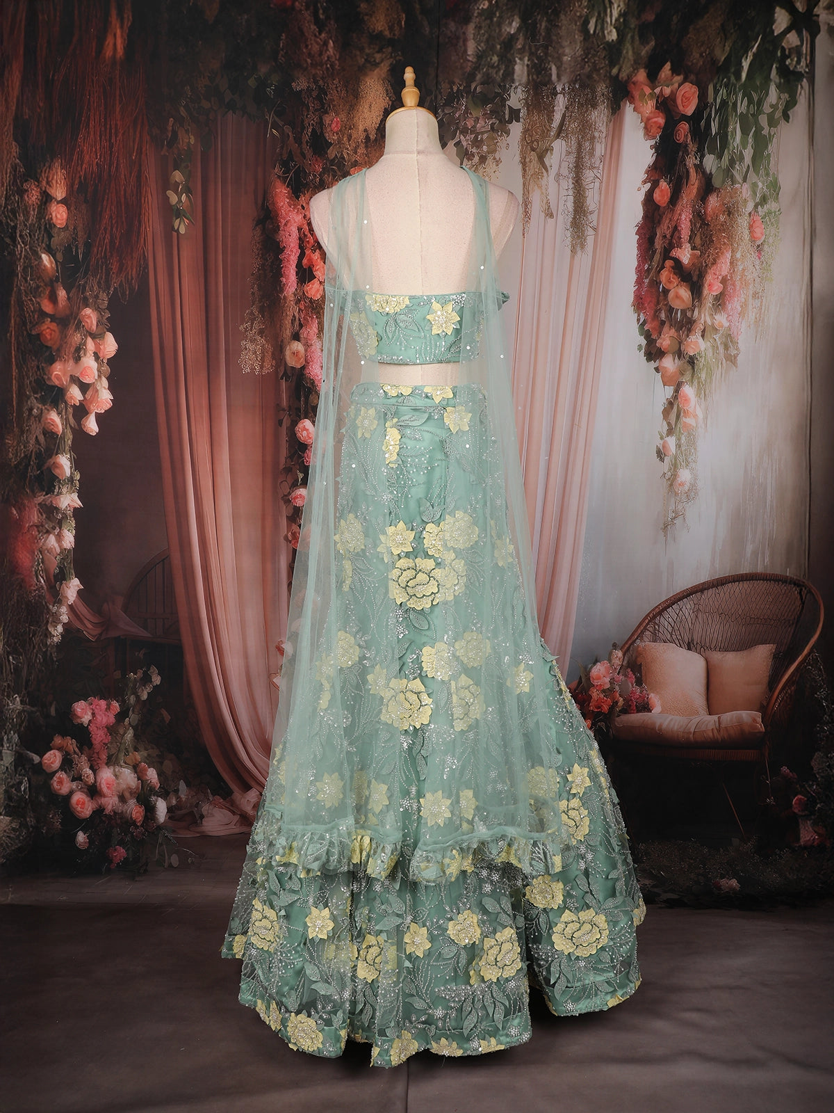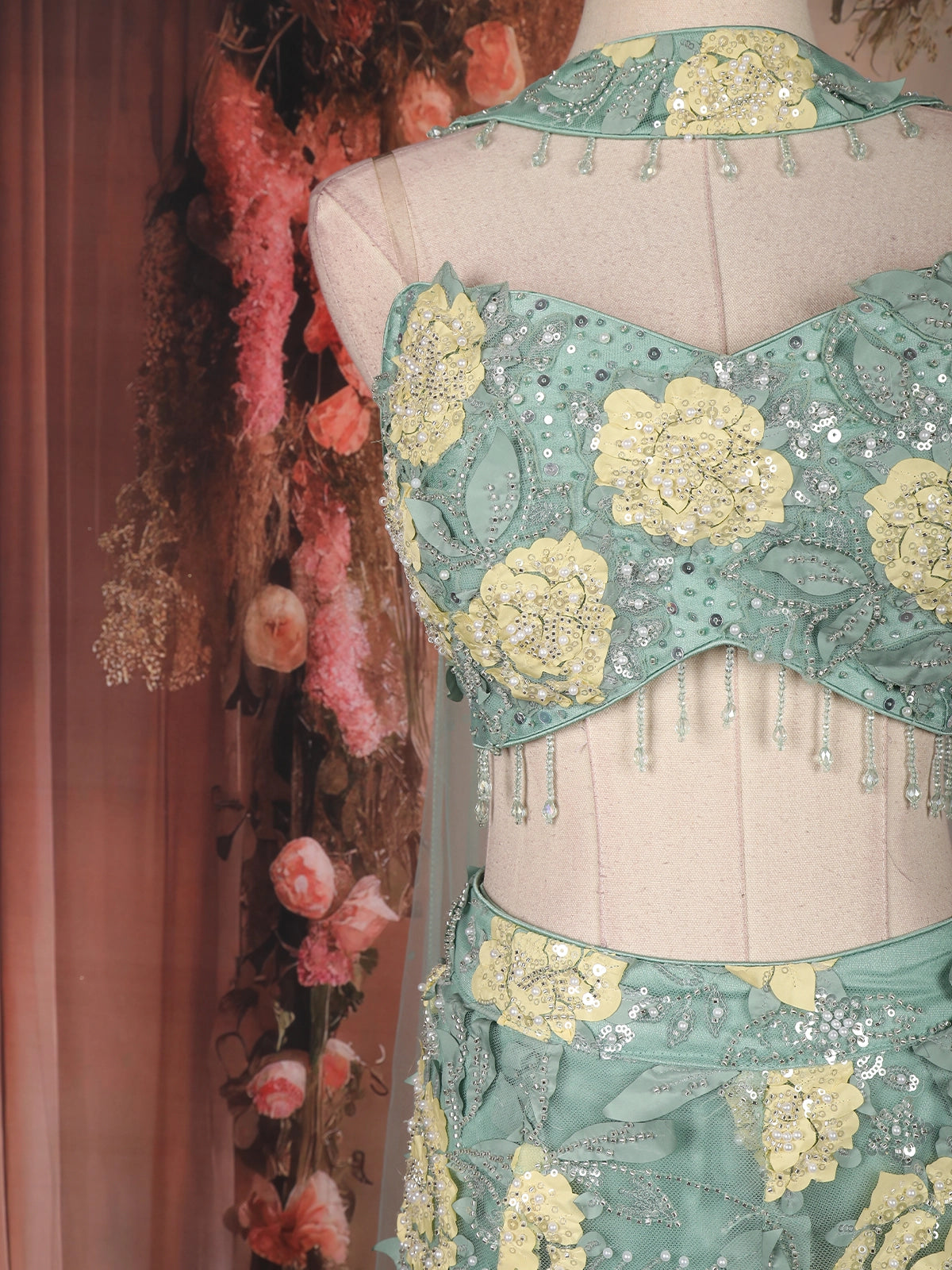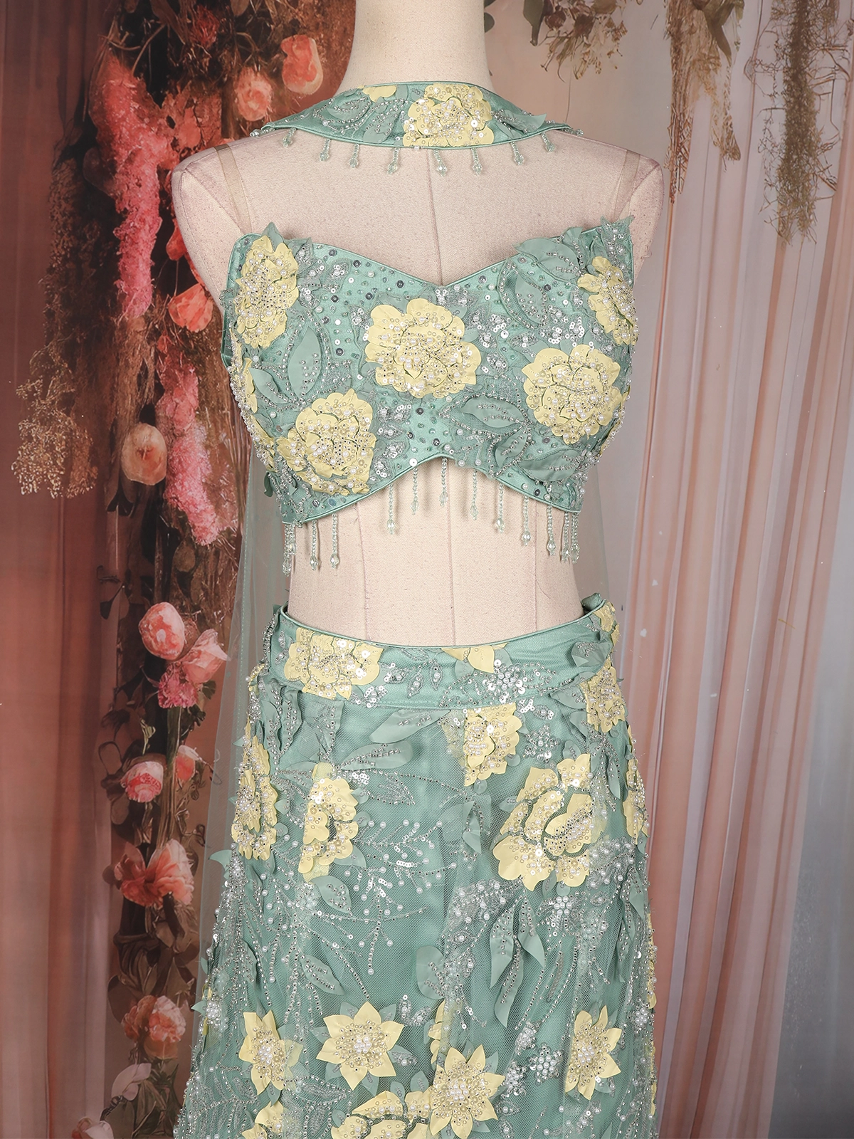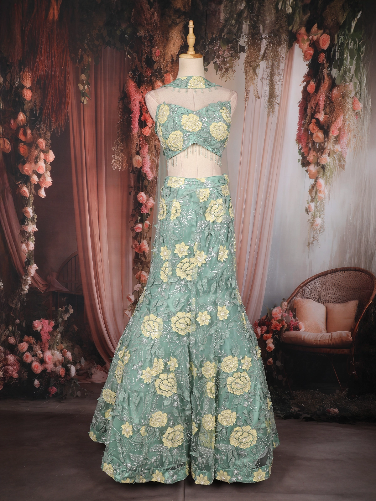Elevate your festive and occasion wear wardrobe with this enchanting pastel sage green mermaid lehenga set, crafted to exude soft elegance and modern charm. Designed in airy net fabric, the ensemble features intricate floral embroidery highlighted with delicate sequins and bead embellishments that create a subtle shimmer with every movement. The blouse is styled with a flattering sweetheart neckline and detailed floral motifs, finished with dainty hanging bead accents that add a graceful touch.