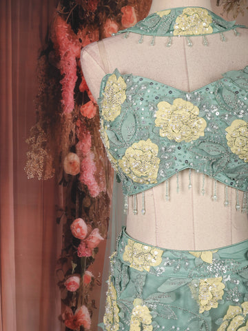 Pastel Sage Green Floral Sequins and Beads Embroidered Mermaid Net Lehenga Set with Choker Dupatta