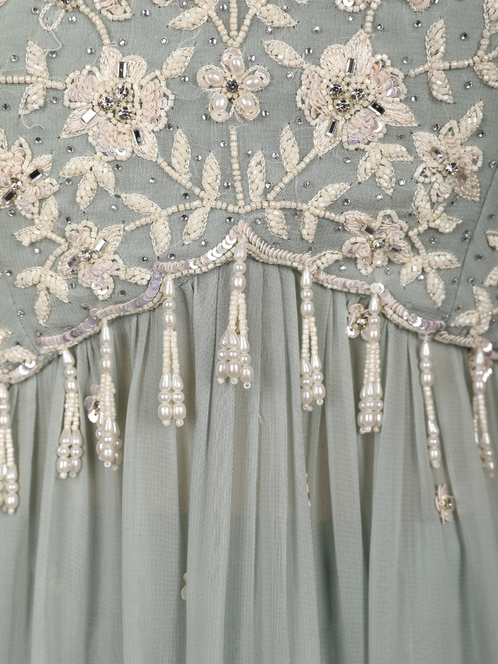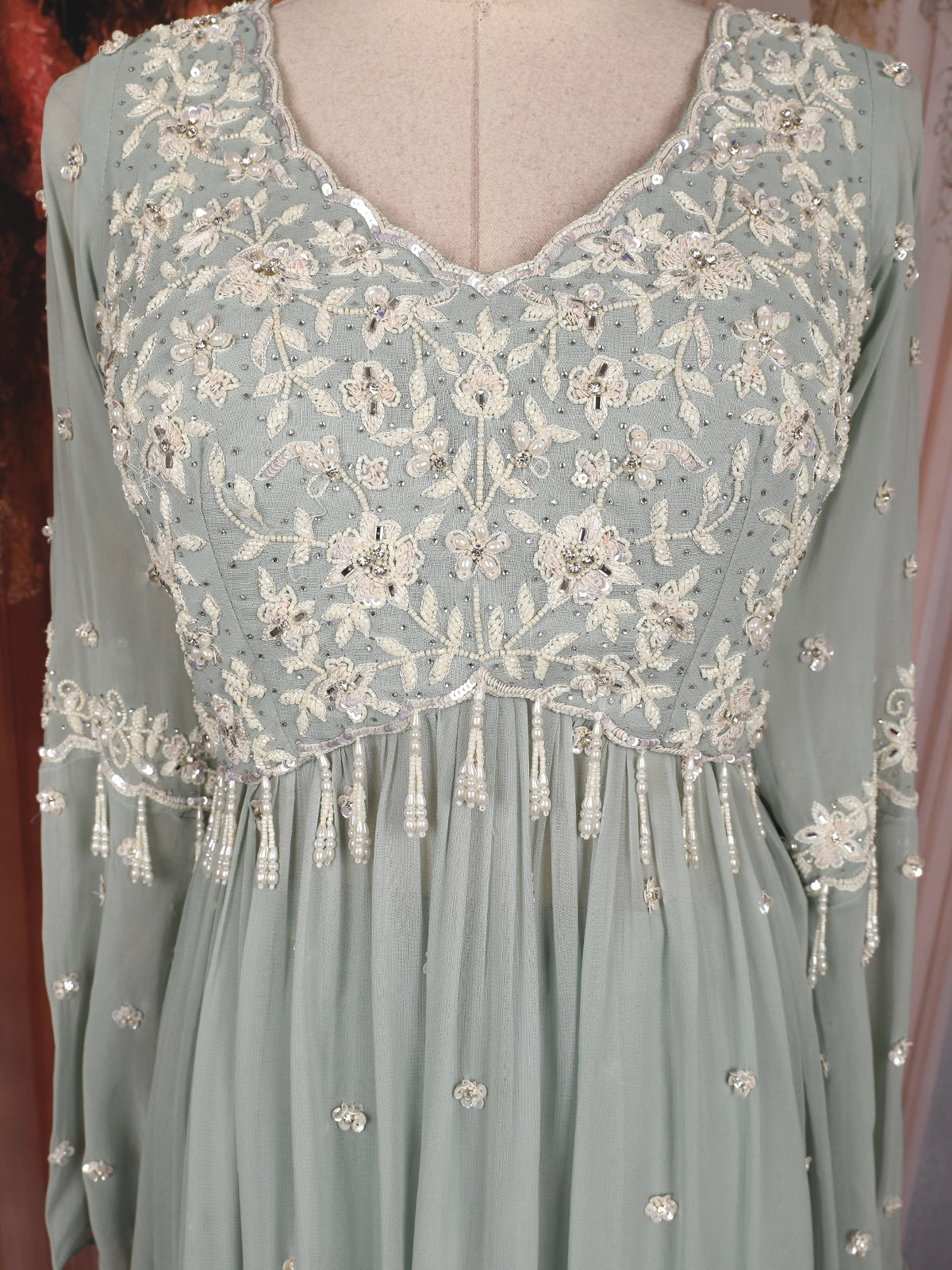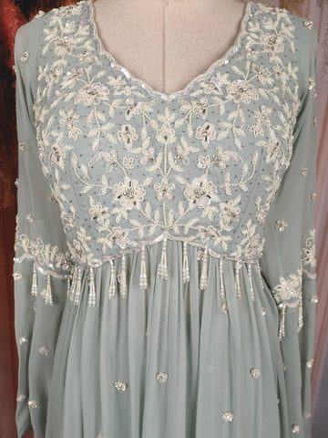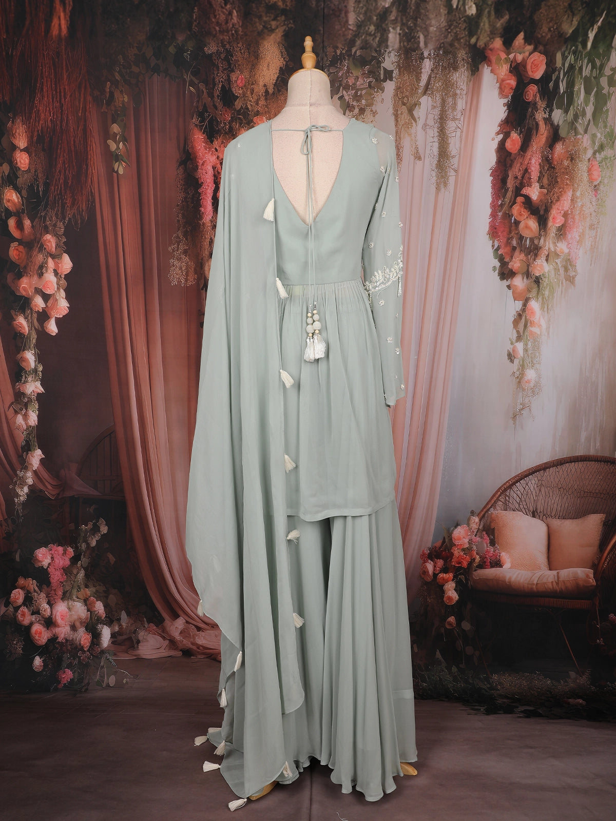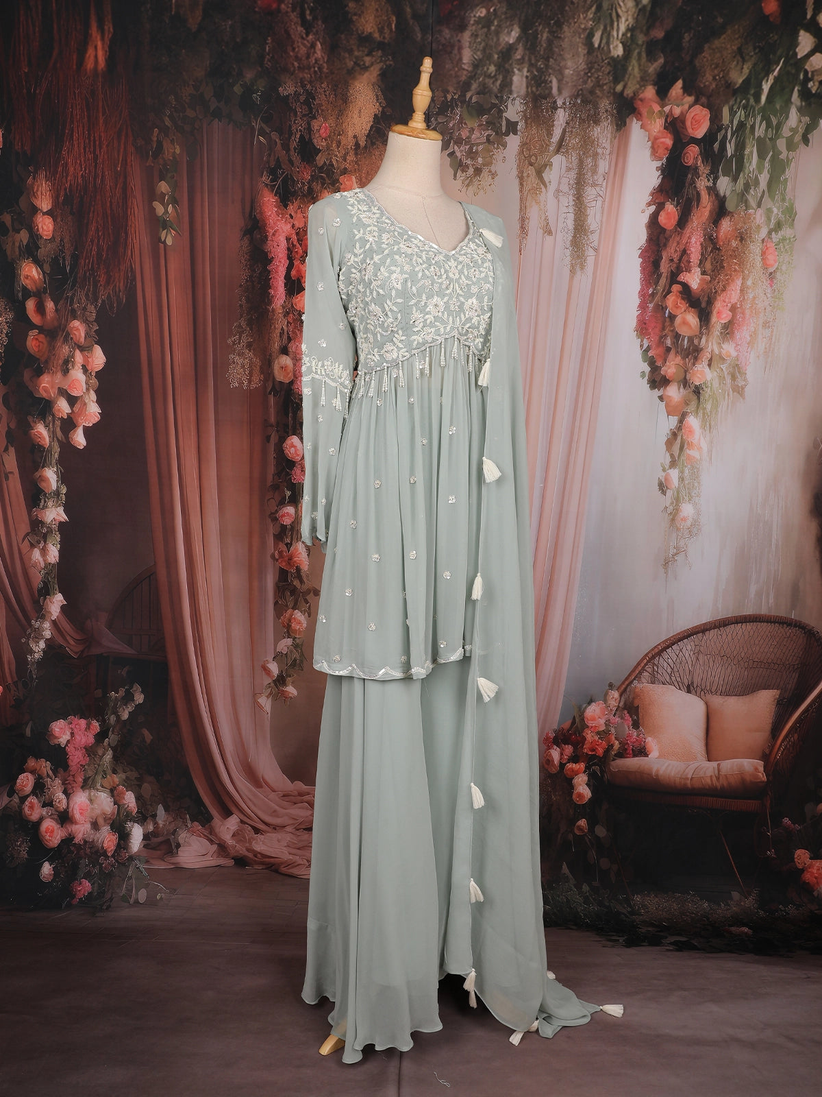 Pastel Sage Green Floral Sequins Embroidered Georgette Palazzo Suit