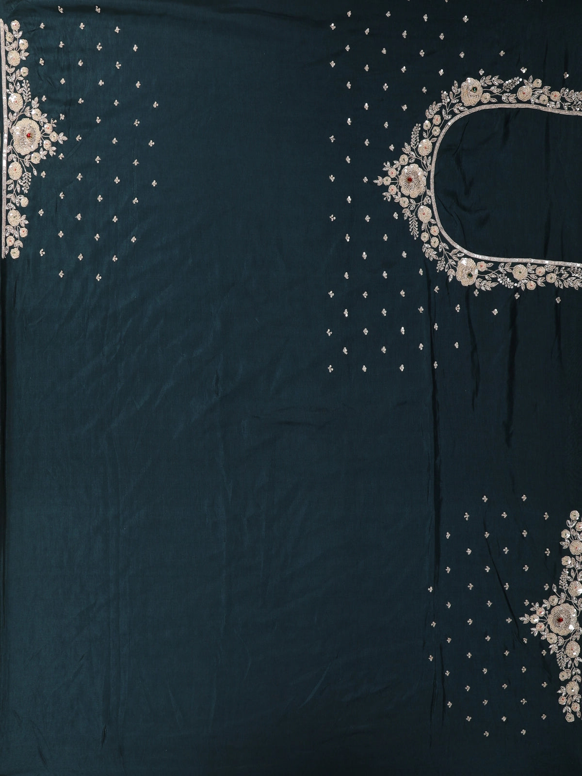 The saree is enhanced with a beautiful scalloped designer border, finished with shimmering sequins work for a refined yet glamorous appeal. Paired with a contrast navy embroidered blouse, this ensemble creates a sophisticated color balance, making it a standout for weddings and celebrations.