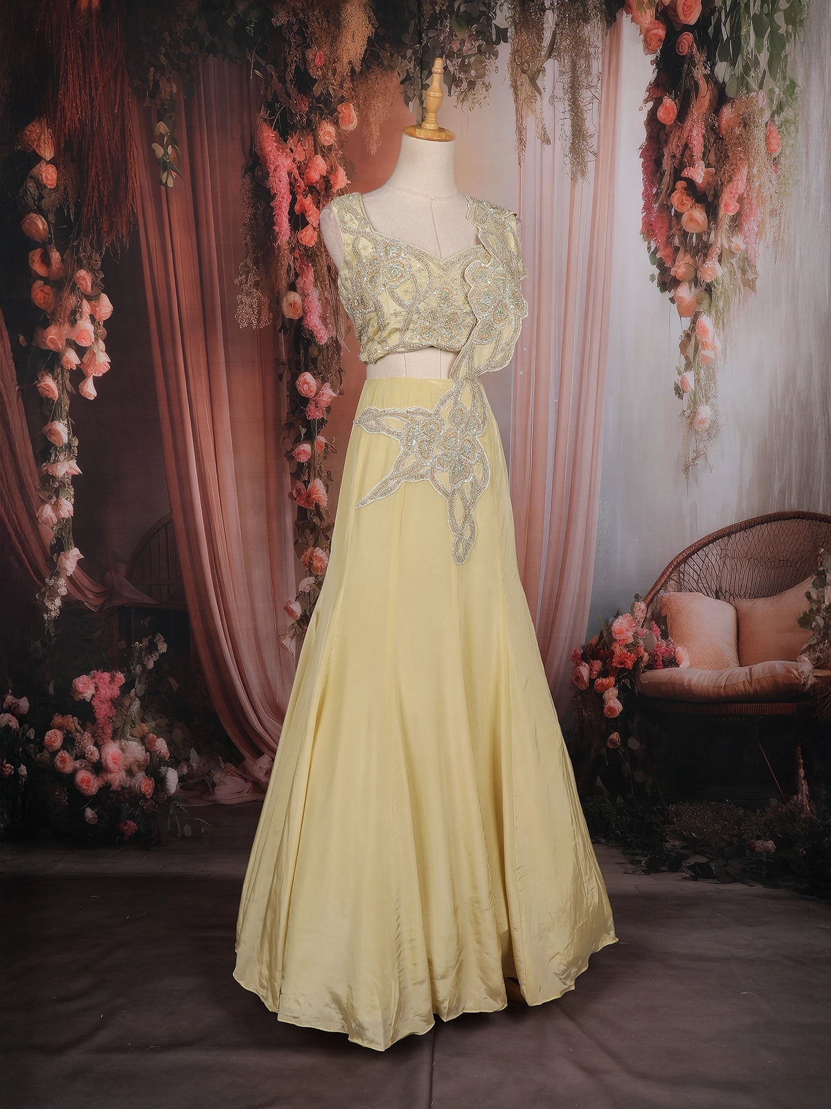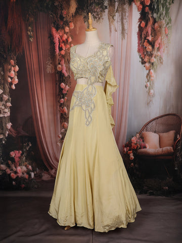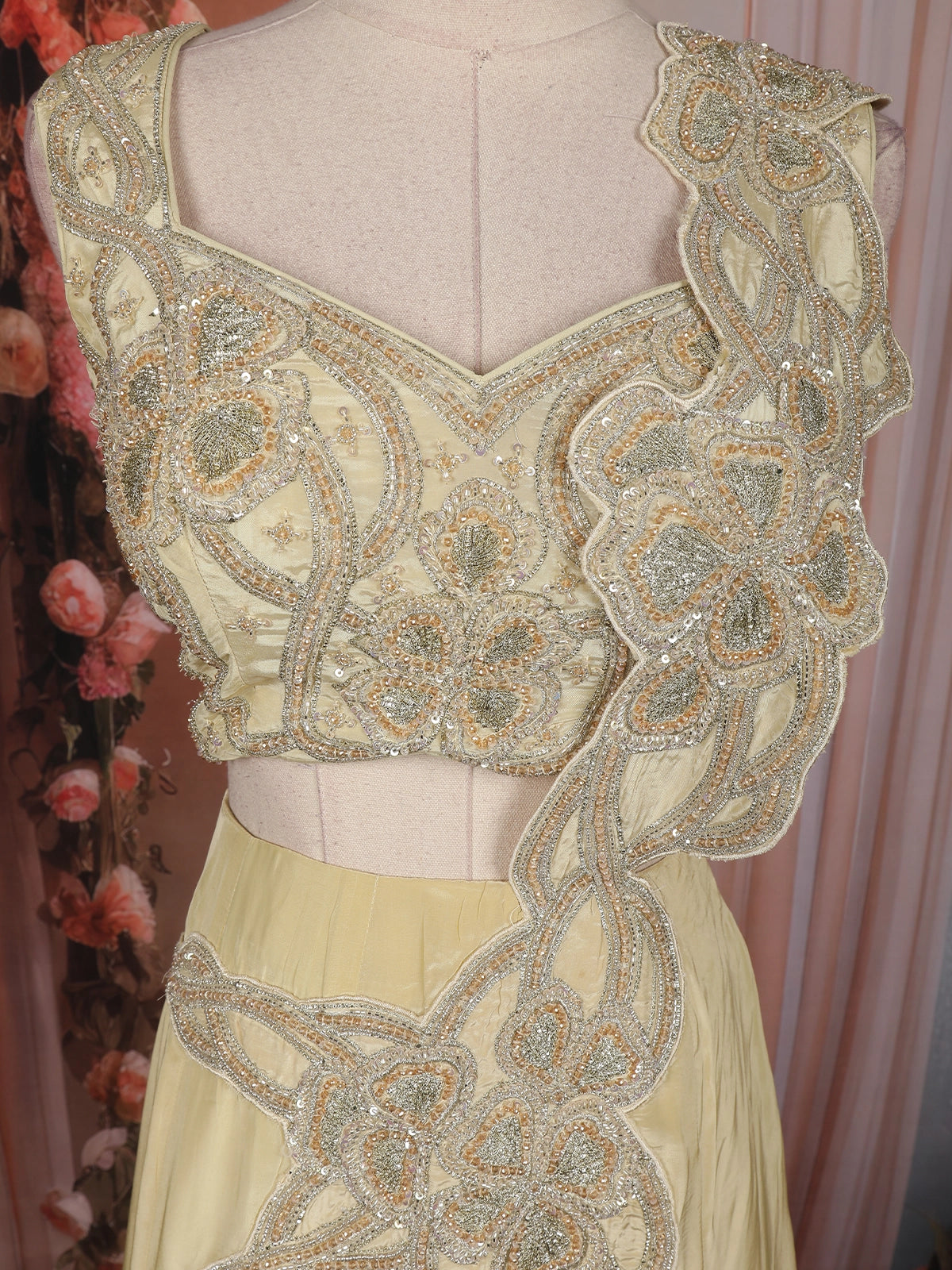 Step into celebration elegance with this charming pastel yellow lehenga set designed with a contemporary silhouette and exquisite detailing. The sleeveless blouse is adorned with intricate sequin and bead embroidery in floral patterns, creating a sparkling and regal appeal. The attached draped panel cascading from the shoulder across the waist enhances the look with a stylish fusion twist, offering a saree-like aesthetic without the hassle of draping.