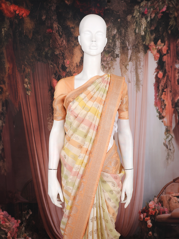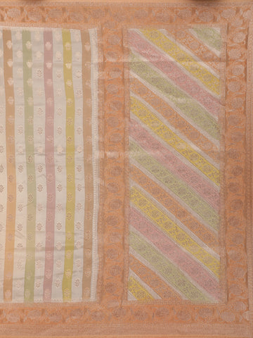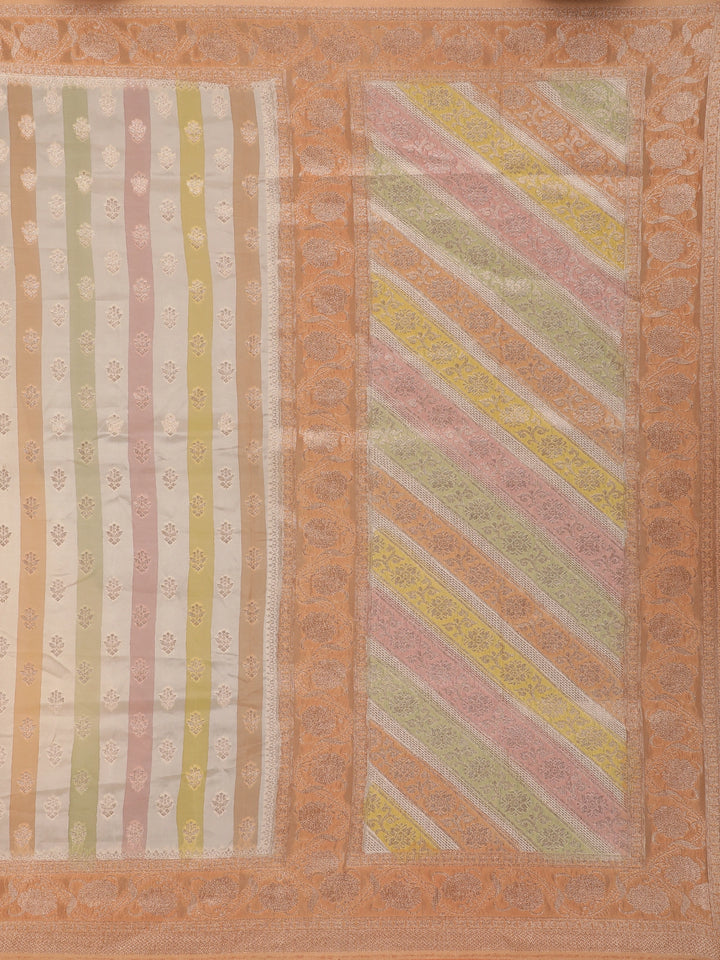 Peach and Multicolor Stripes Woven Banarasi Silk Saree with Contrast Zari Border