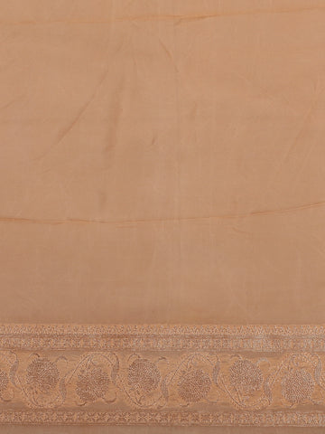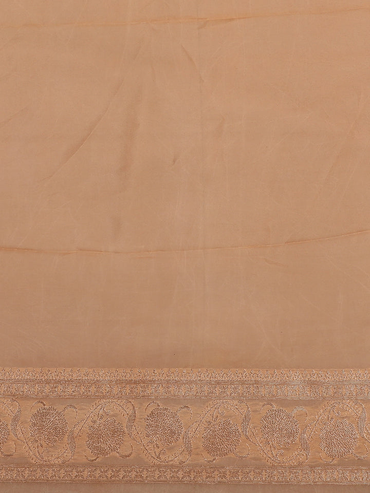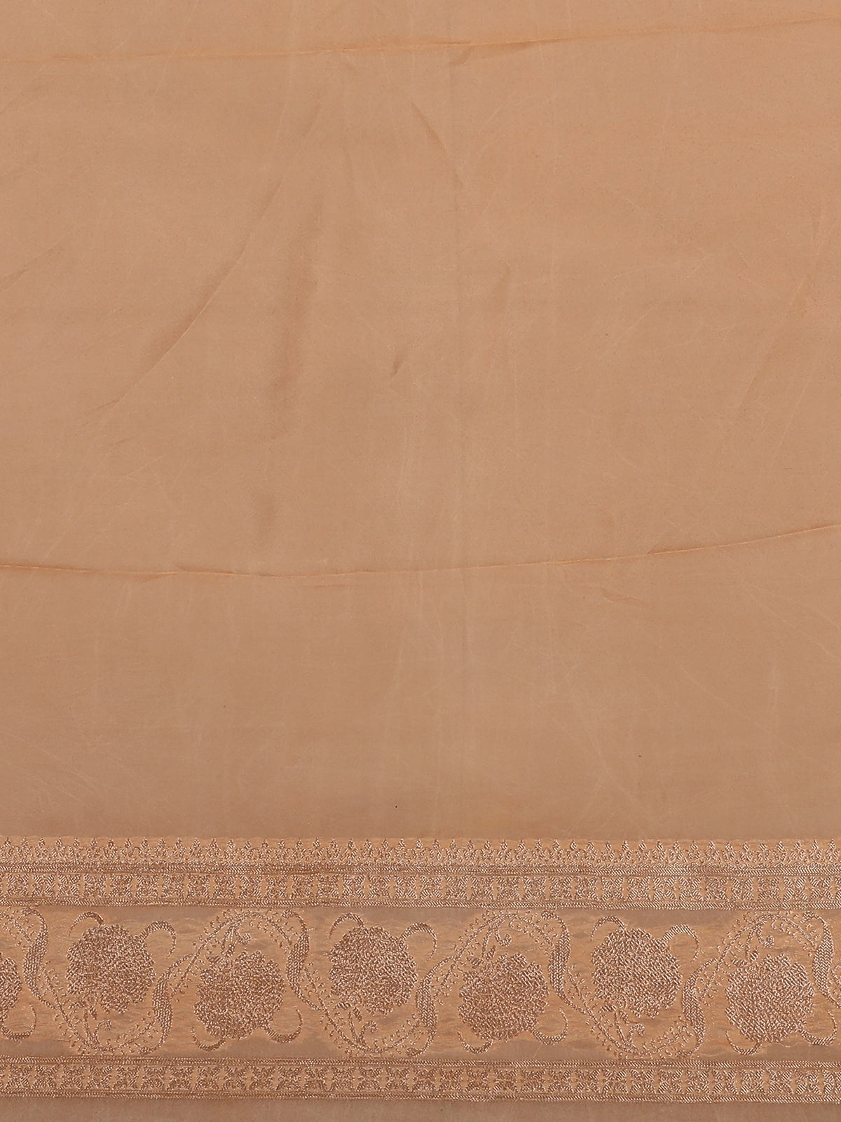The lustrous Banarasi silk fabric enhances the drape’s luxurious feel, while the rich peach zari border intricately woven with floral vines adds a regal charm. The matching peach blouse complements the saree perfectly, featuring elegant woven detailing for a seamless, graceful ensemble.