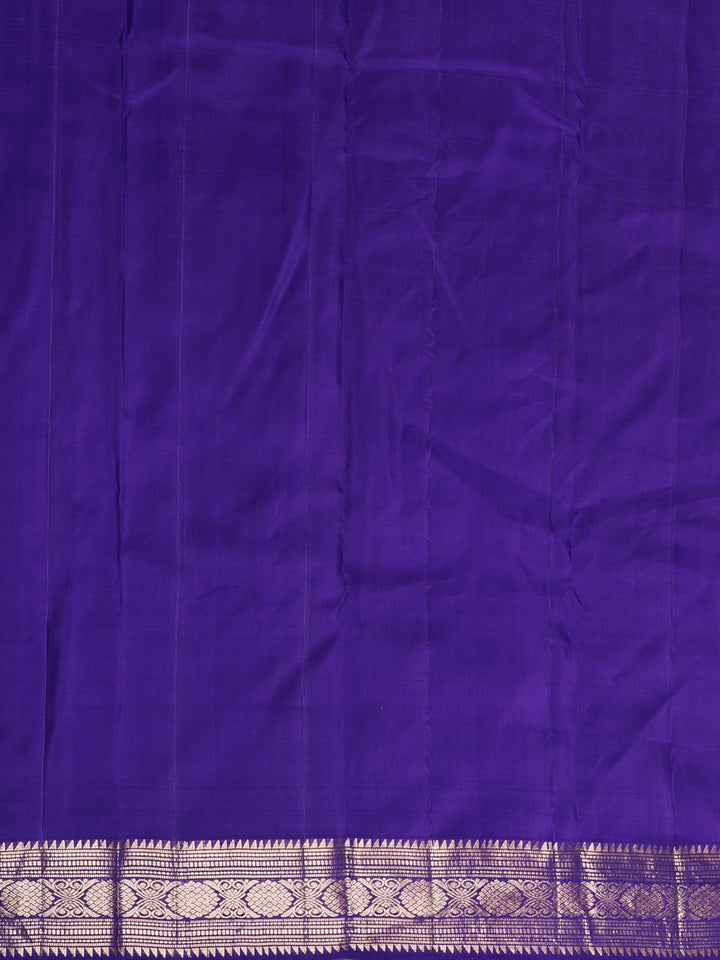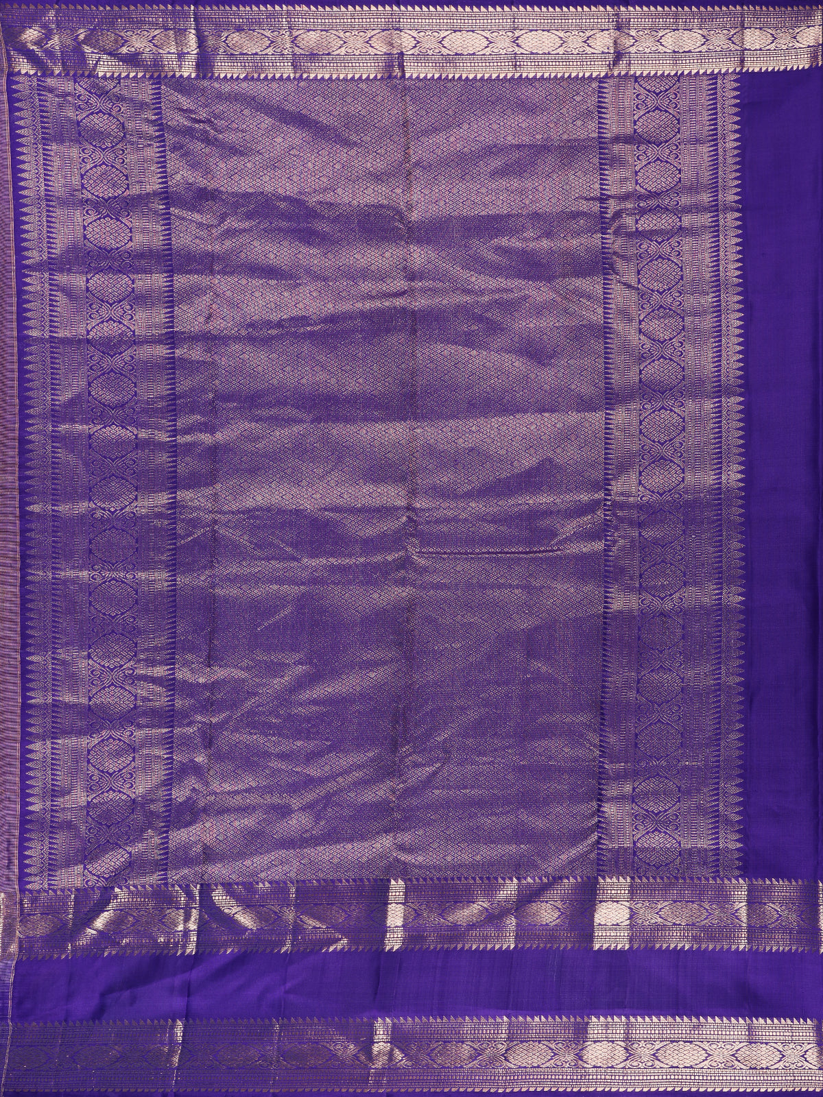 The highlight of the saree is its contrast purple pallu and blouse, enriched with intricate zari weaving that elevates the grandeur of the ensemble. The rich zari border in traditional patterns frames the saree beautifully, adding depth and a touch of opulence to its understated base.