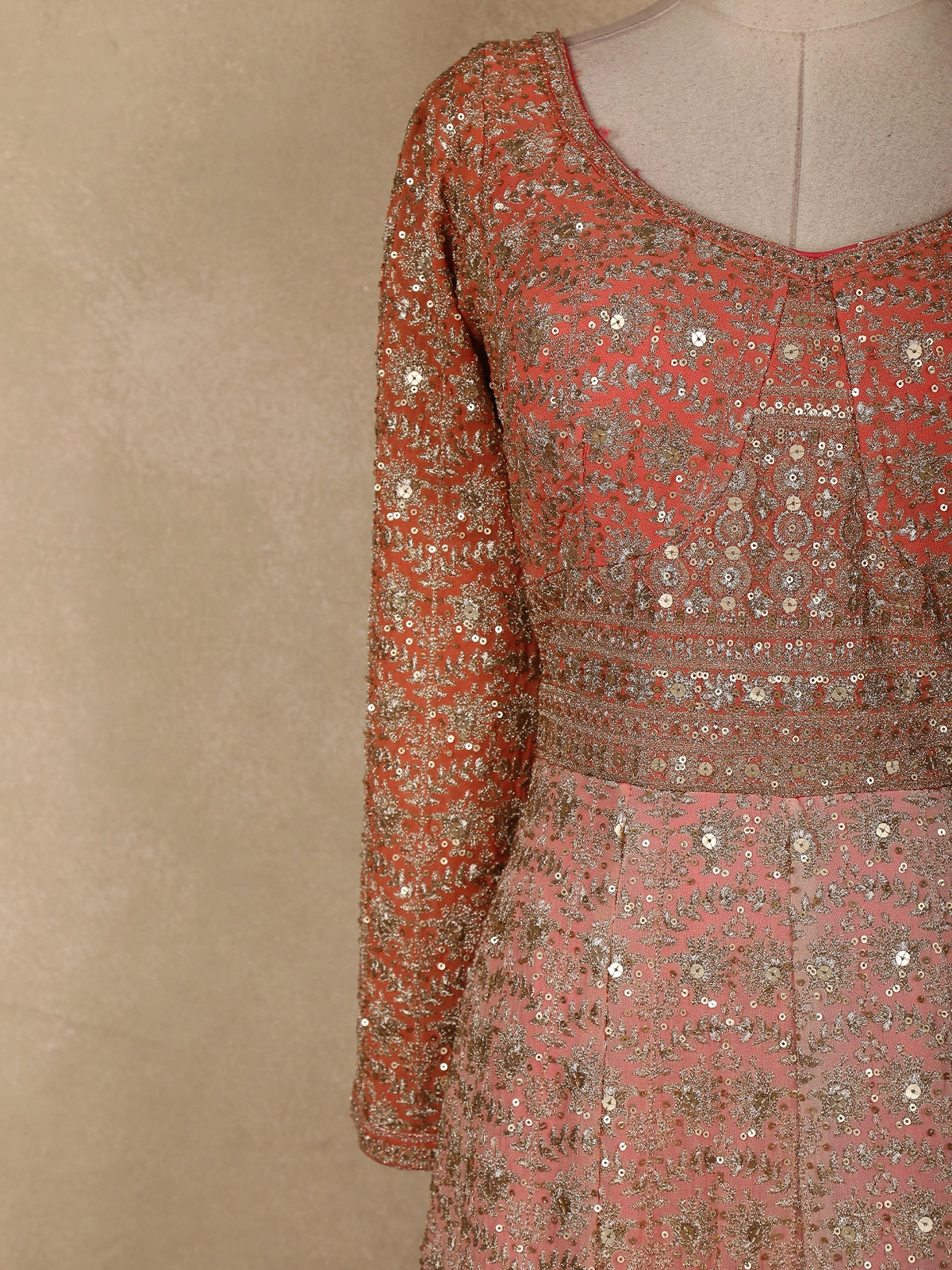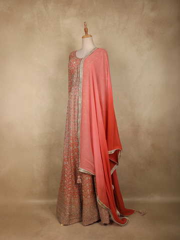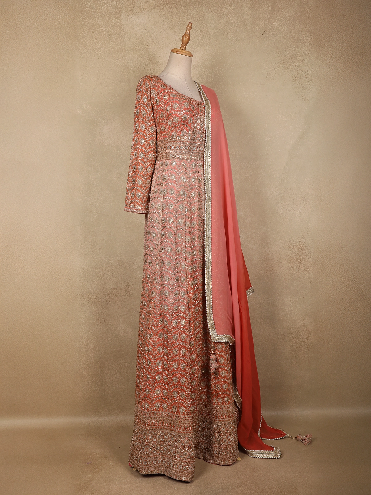 Peach Coral Heavy Sequins and Zari Embroidered Georgette Gown with Dupatta