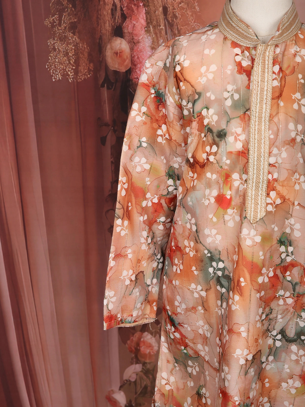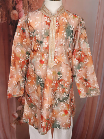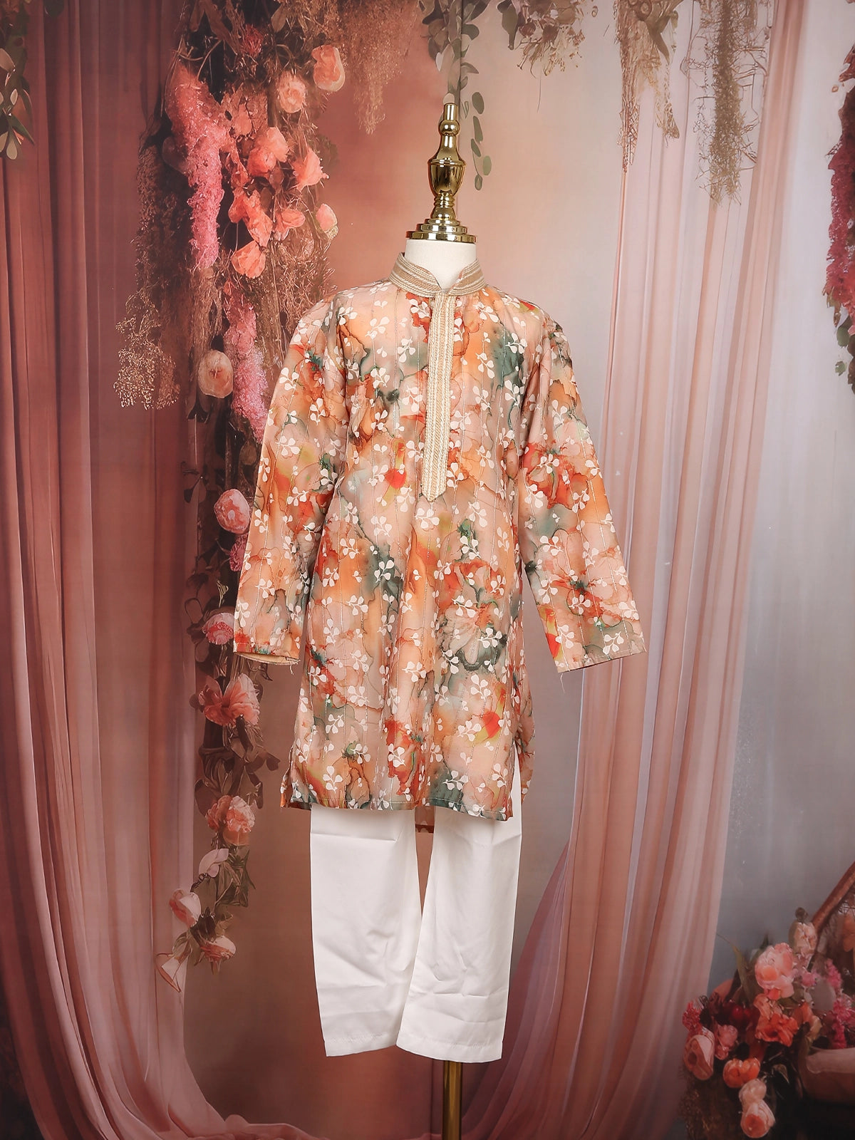 Dress your little one in festive elegance with this charming Peach Floral Digital Printed Kurta Set. Crafted with soft and breathable cotton fabric, this outfit ensures complete comfort while keeping the style quotient high. The kurta features a vibrant floral digital print that adds a playful yet sophisticated appeal, perfect for the little trendsetter.