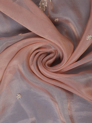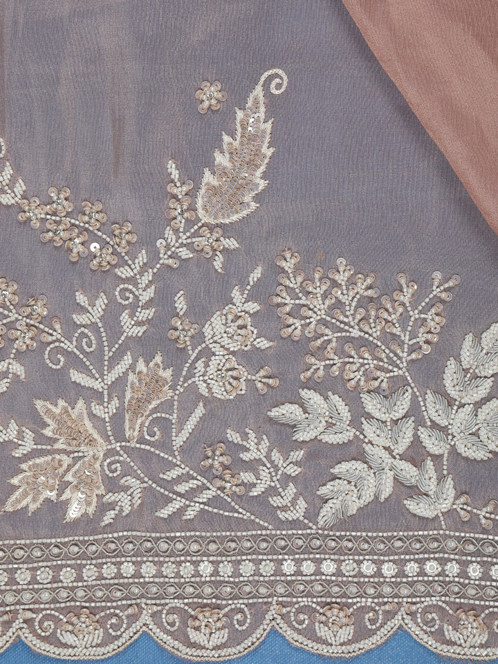 Grace your special occasions in sheer sophistication with this Peach Floral Embroidered Net Organza Tissue Saree. Crafted from delicate net fabric, this saree showcases intricate floral embroidery in elegant thread and bead detailing, lending it a touch of modern opulence. The scalloped embroidered border enhances its ethereal charm, beautifully complementing the soft peach hue.