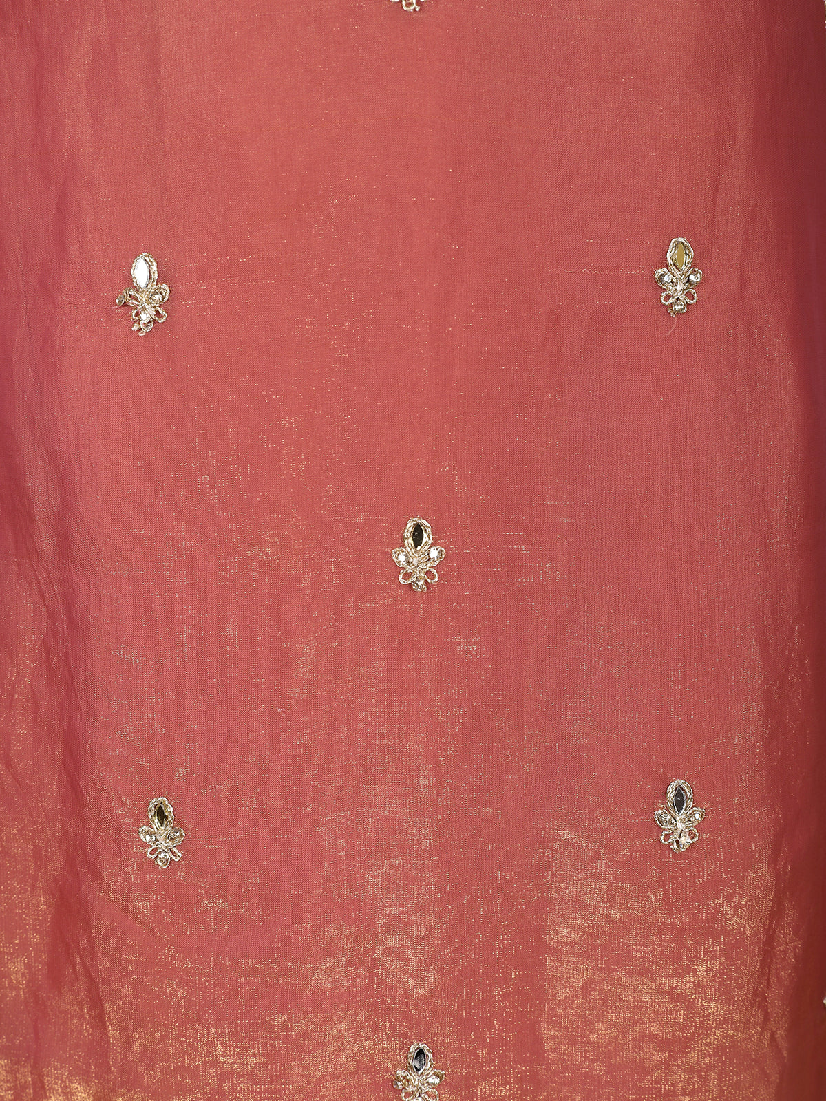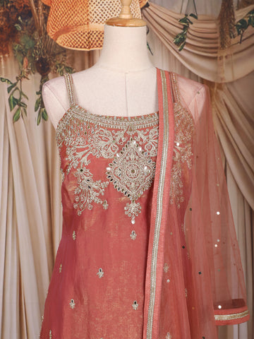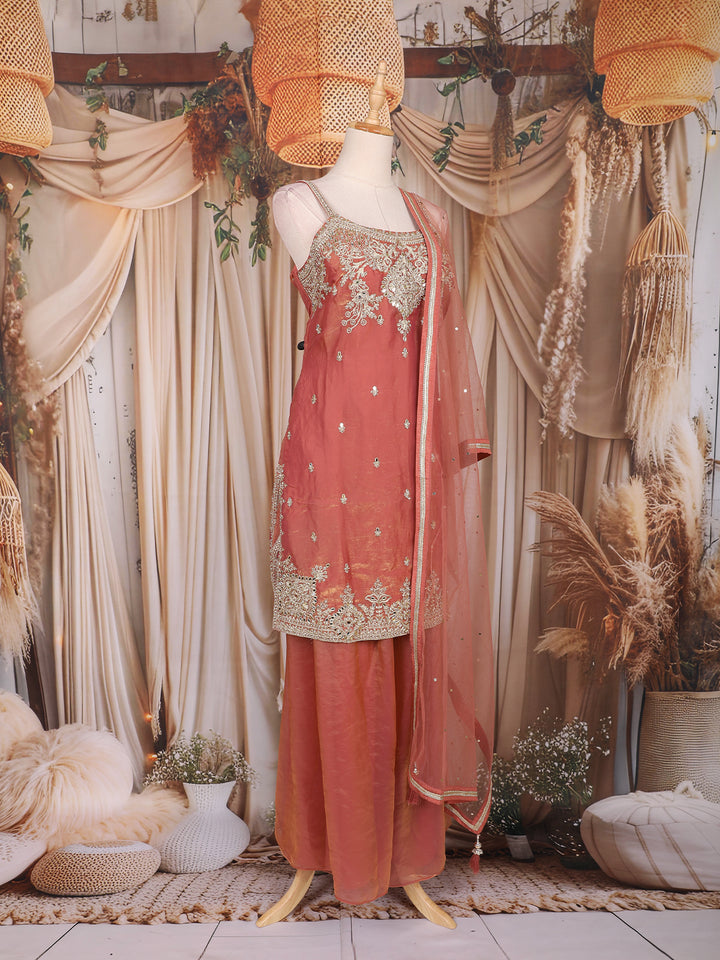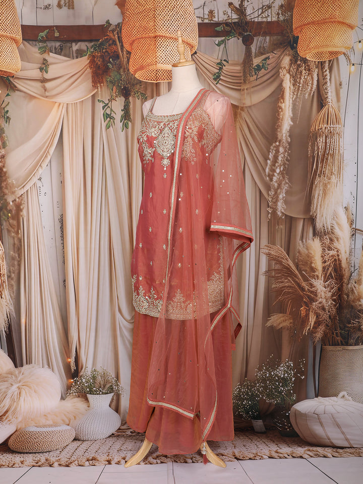 Peach Floral Embroidered Design Organza Palazzo Suit