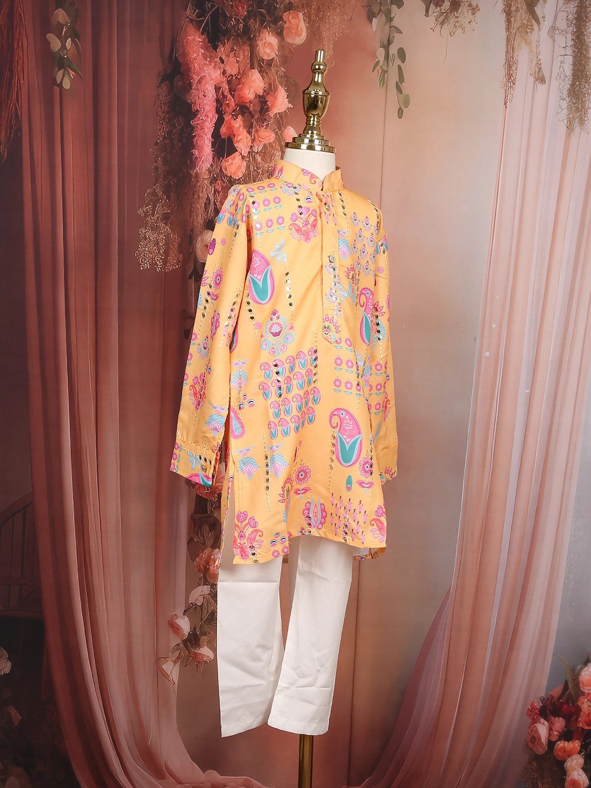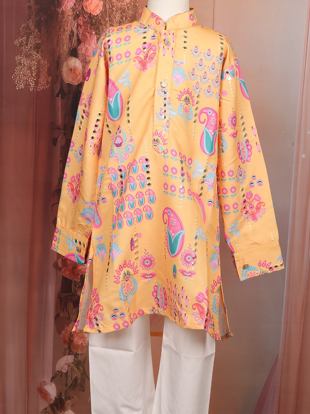 Brighten up festive moments with this charming Peach Multi Motif Printed Kurta Set for kids. The kurta features vibrant ethnic-inspired motifs in playful shades of pink, blue, and yellow, paired with mirror-effect embellishment for a touch of sparkle. Designed with a mandarin collar, button placket, and full sleeves, it blends traditional elegance with a fun and colorful feel.
