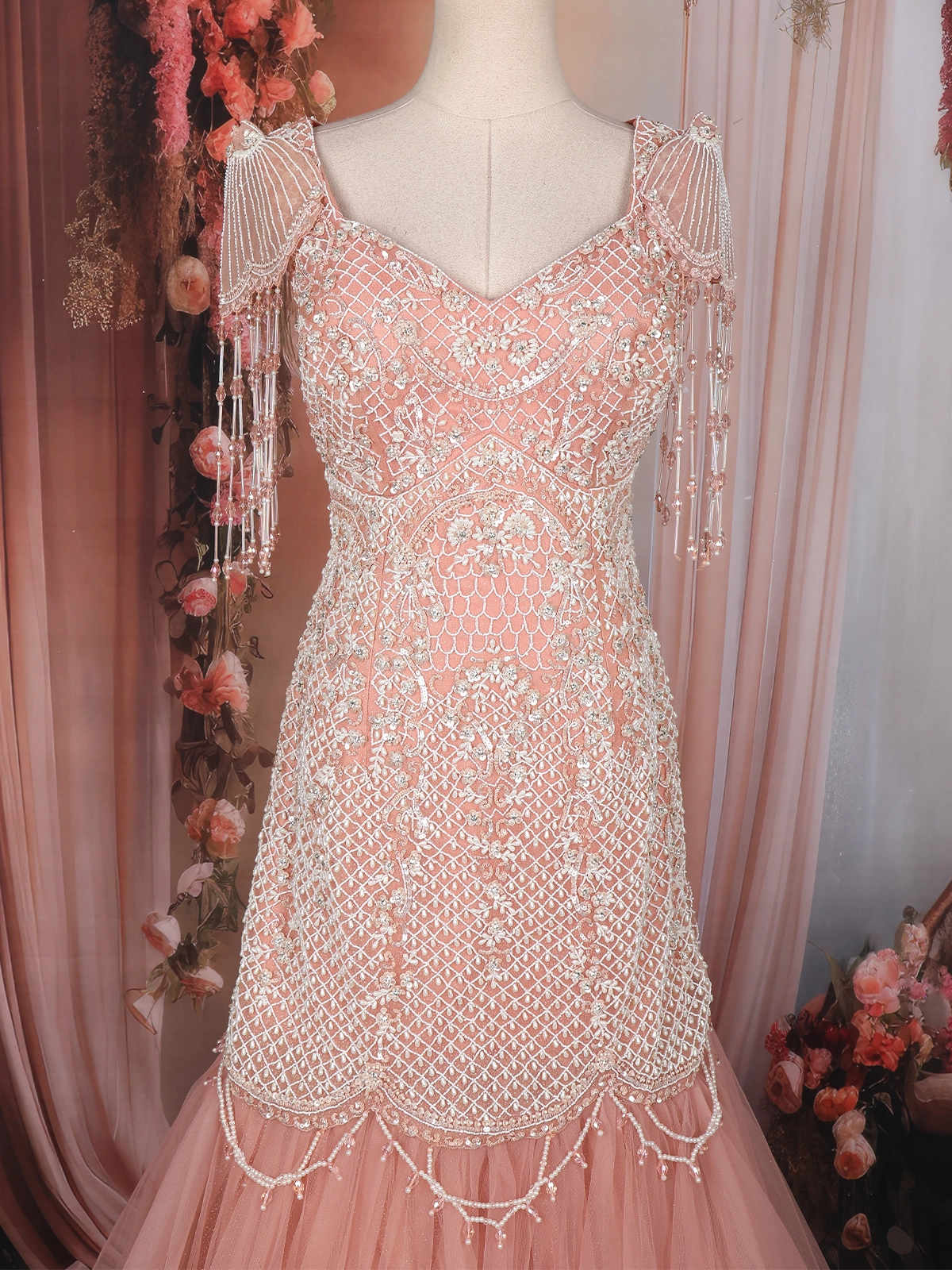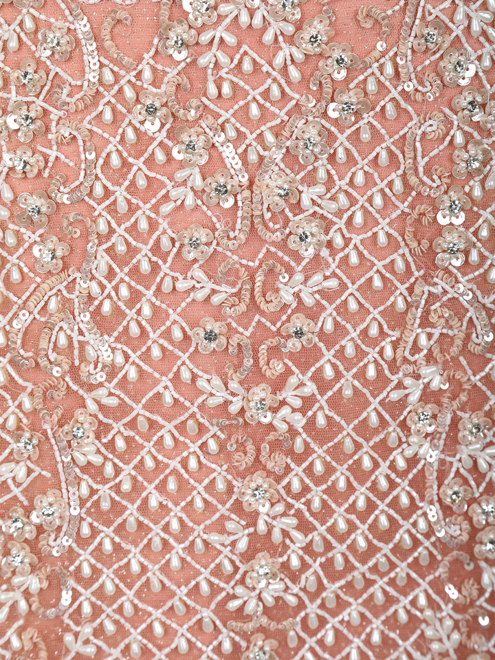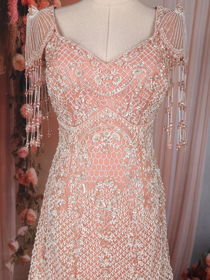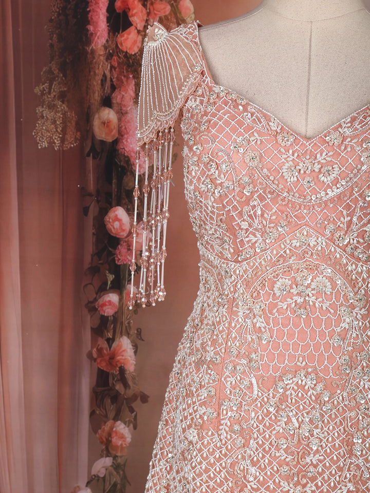 Step into ethereal elegance with this breath-taking Peach Mermaid Gown, exquisitely crafted for glamorous celebrations and premium festive occasions. The bodice features intricate floral and lattice sequins embroidery enriched with shimmering beads that bring a radiant sparkle from every angle. A beautifully flared tulle lower adds graceful volume, giving the silhouette a fairy-tale charm.