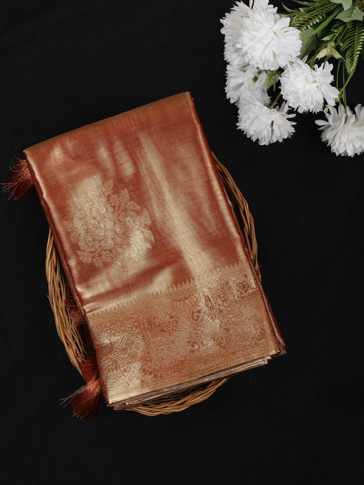 Crafted from premium tissue silk, the saree offers a feather-light drape with a rich, glossy finish that looks effortlessly elegant in motion. The look is elevated by a finely detailed antique gold zari border, lending a classic touch, while the stylish tassels on the pallu bring in a contemporary charm. Perfect for festive occasions, receptions, evening functions, and elegant celebrations, this saree pairs beautifully with antique, pearl, or minimal gold jewellery for a poised and graceful ethnic ensemble.