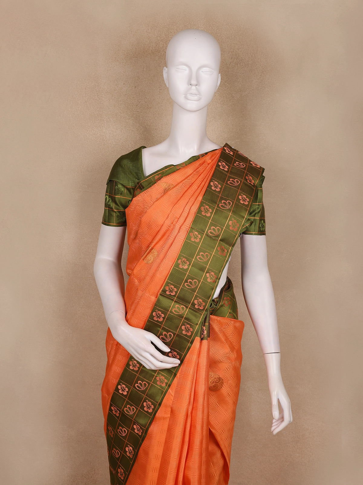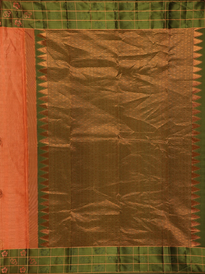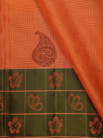 Radiate festive charm in this captivating Peach Orange and Olive Green Kanchipuram Silk Saree, a stunning confluence of vibrant color and intricate craftsmanship. The saree’s peach-orange silk body is adorned with subtle woven textures and delicate buttas, creating a soft yet luxurious sheen. The highlight of the drape is its olive green checked zari border, intricately woven with floral and heart motifs — a design that beautifully bridges tradition and elegance.