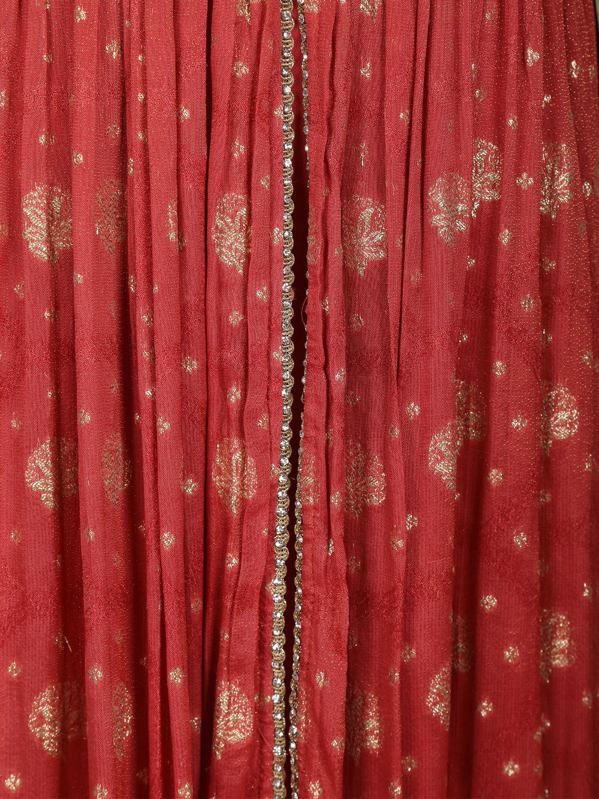 Paired with a flowy Banarasi silk palazzo, the ensemble offers both comfort and sophistication, making it ideal for long celebrations. The look is completed with a matching Banarasi dupatta, featuring fine zari borders and scattered butta accents that drape effortlessly and add a regal finish.