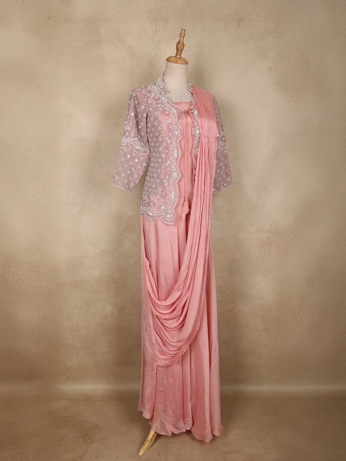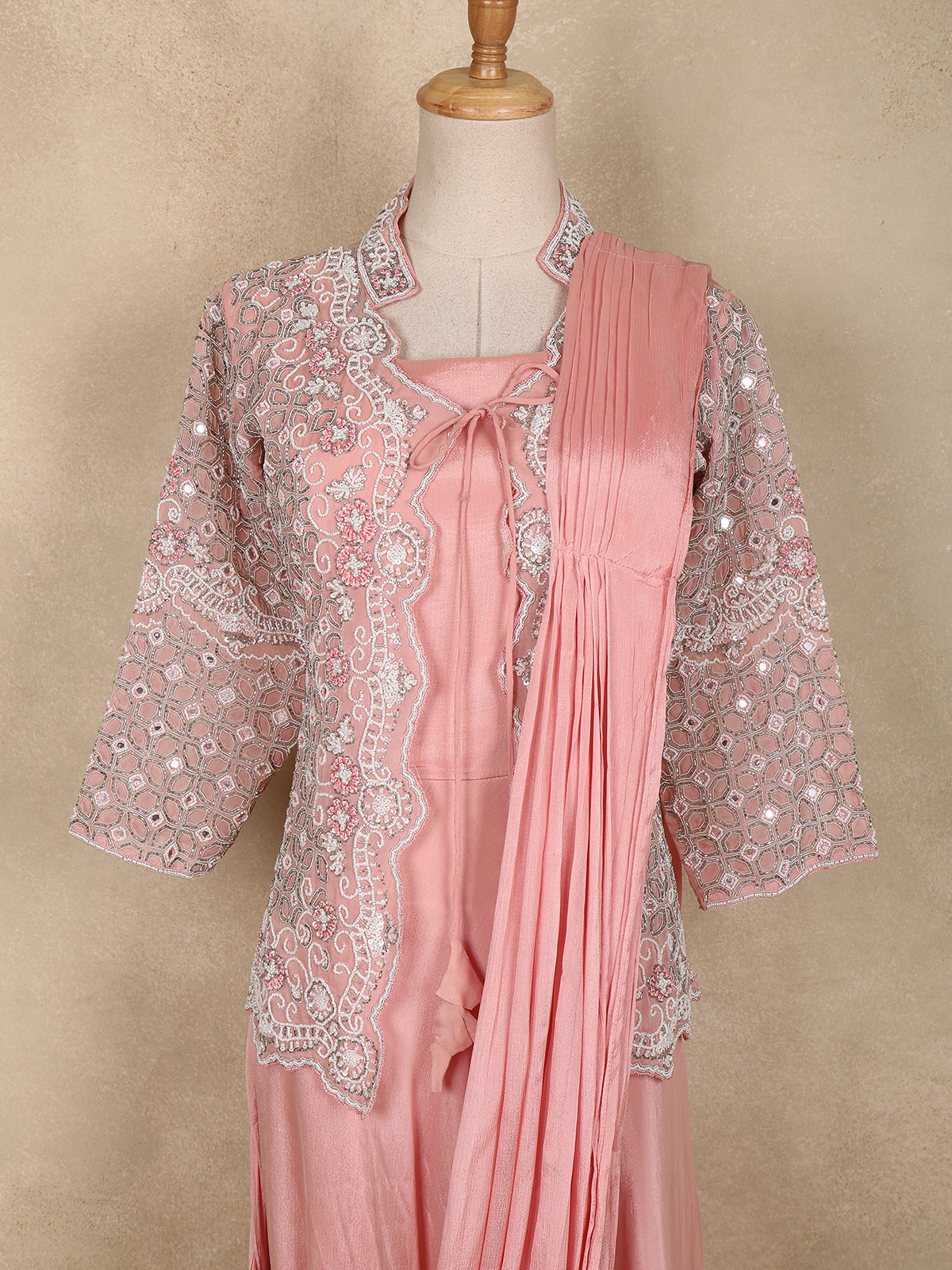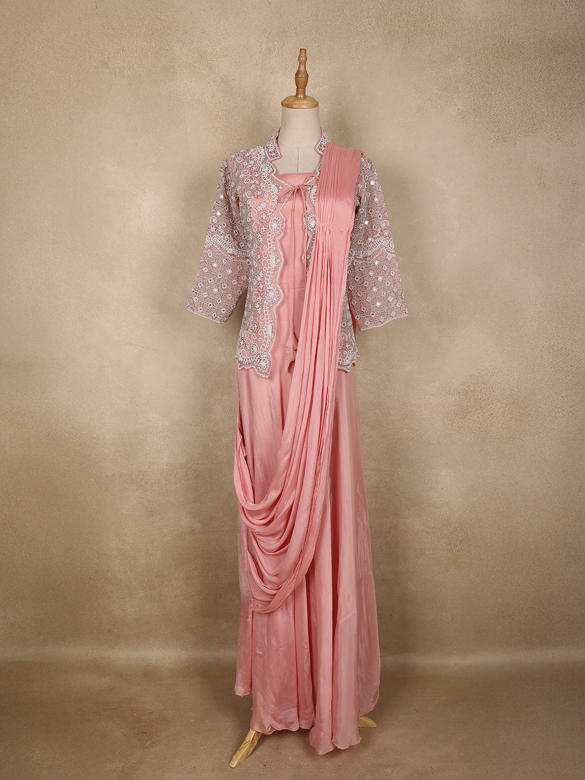 Peach Pink Embroidered Design Jacket Georgette Gown with Draped Dupatta