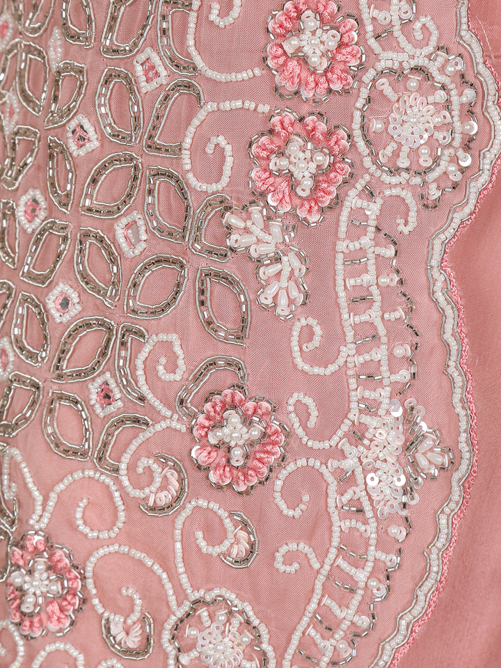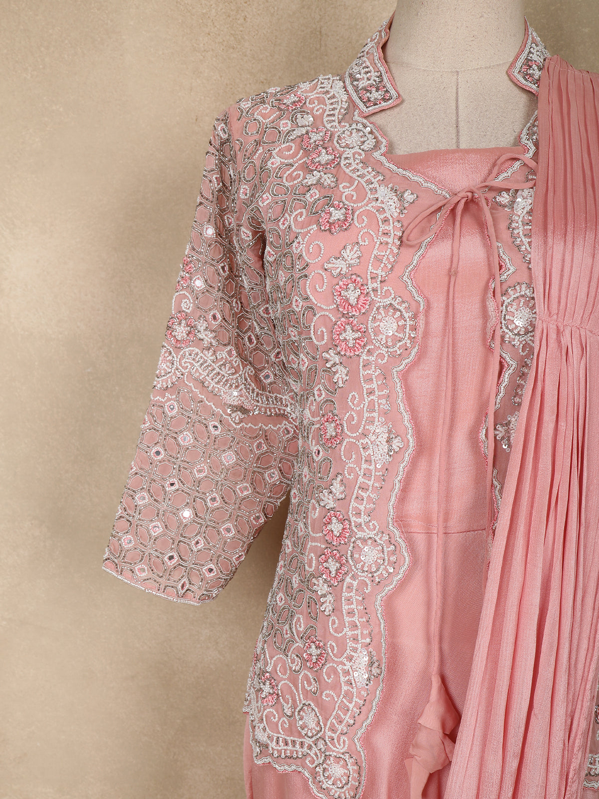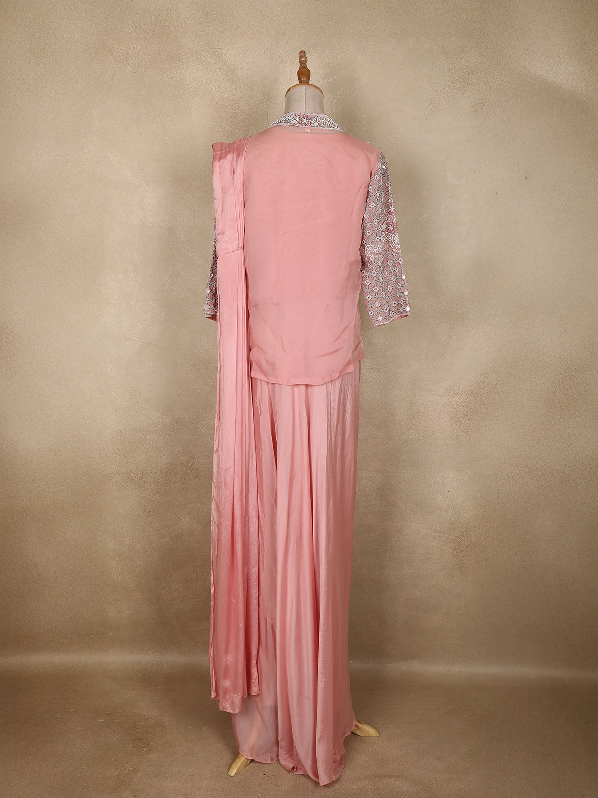 Peach Pink Embroidered Design Jacket Georgette Gown with Draped Dupatta