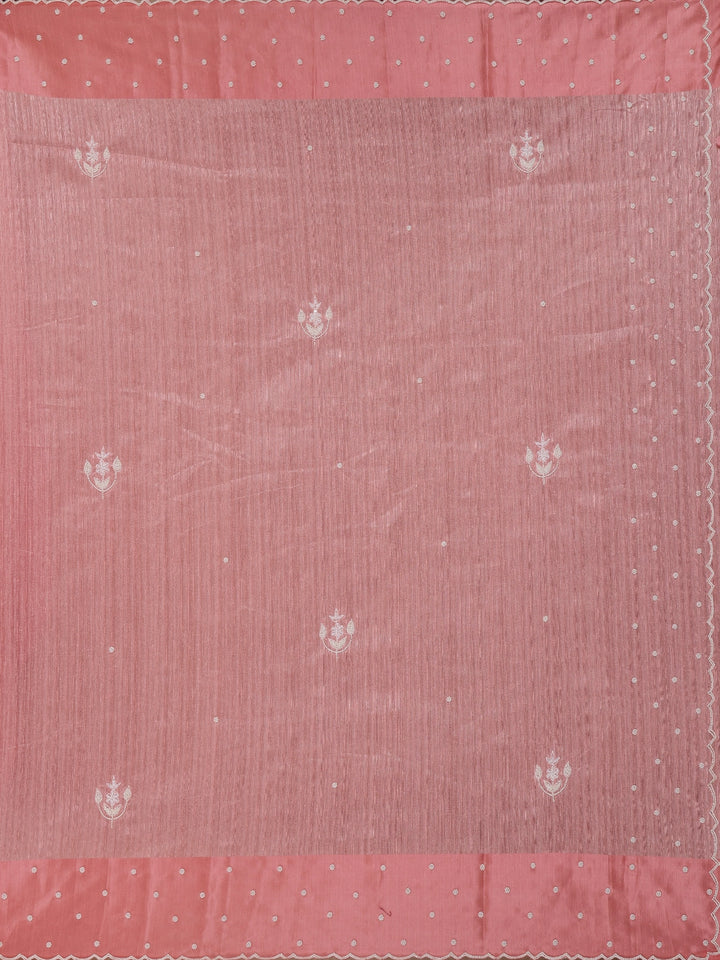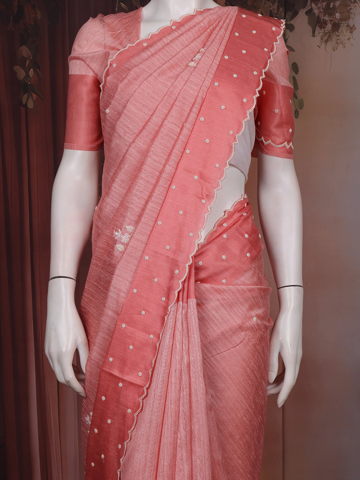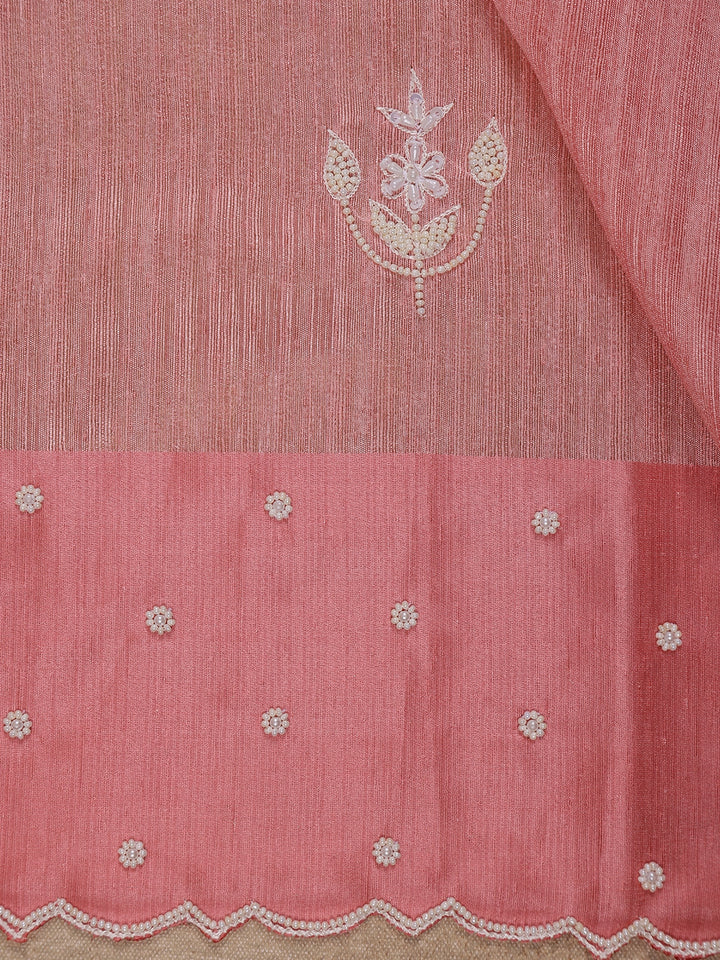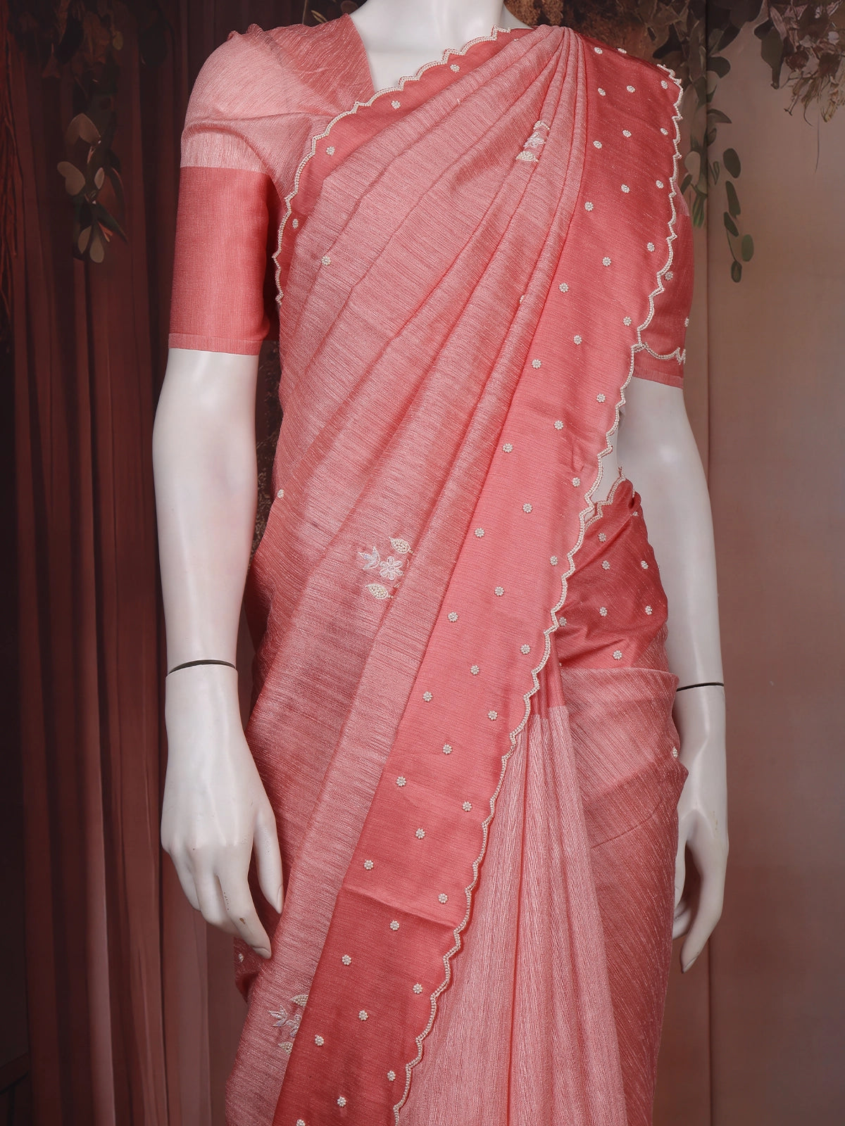 Drape yourself in understated luxury with this Peach Pink Floral Embroidered Raw Silk Saree, a graceful blend of charm and sophistication. Crafted from lustrous raw silk, the saree radiates a soft sheen that complements its pastel hue beautifully. Intricate floral thread embroidery dances across the body, while delicate dotted motifs enhance its refined appeal.