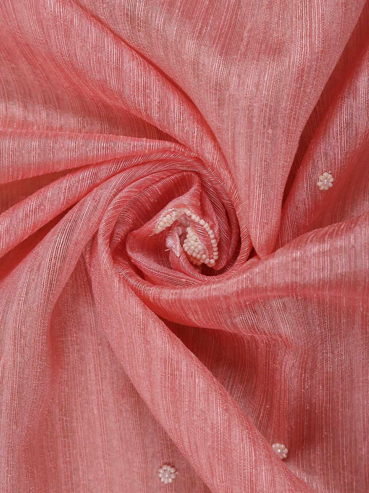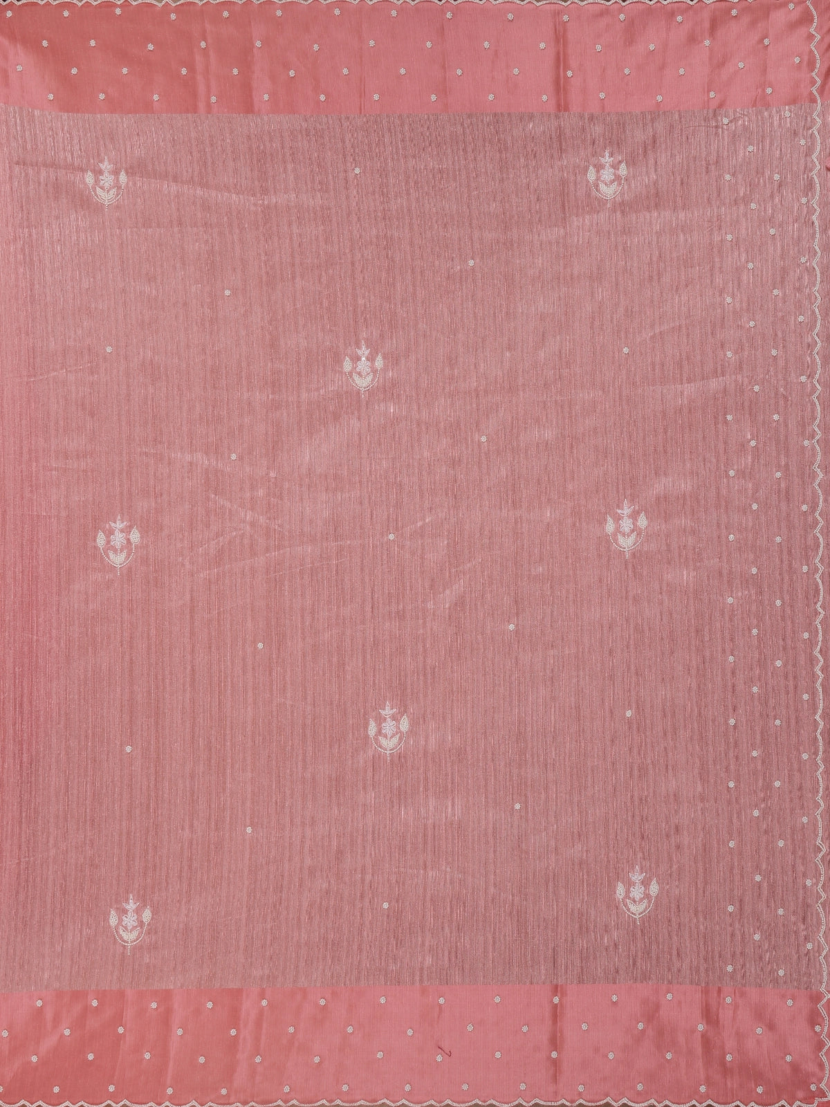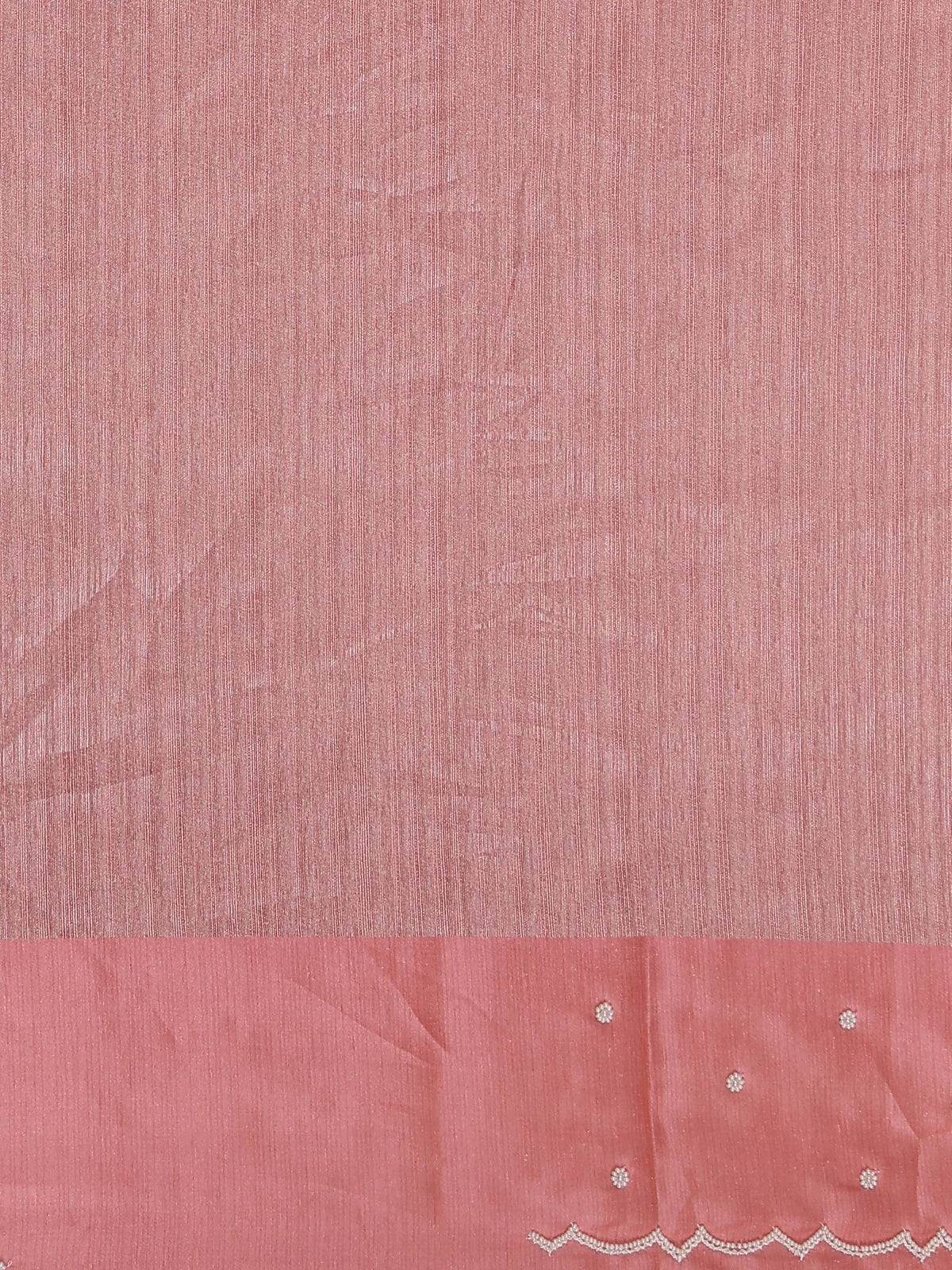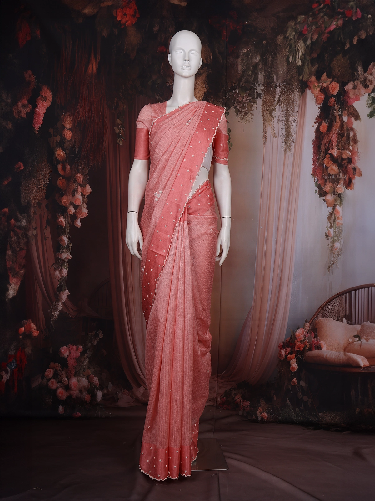 Drape yourself in understated luxury with this Peach Pink Floral Embroidered Raw Silk Saree, a graceful blend of charm and sophistication. Crafted from lustrous raw silk, the saree radiates a soft sheen that complements its pastel hue beautifully. Intricate floral thread embroidery dances across the body, while delicate dotted motifs enhance its refined appeal.