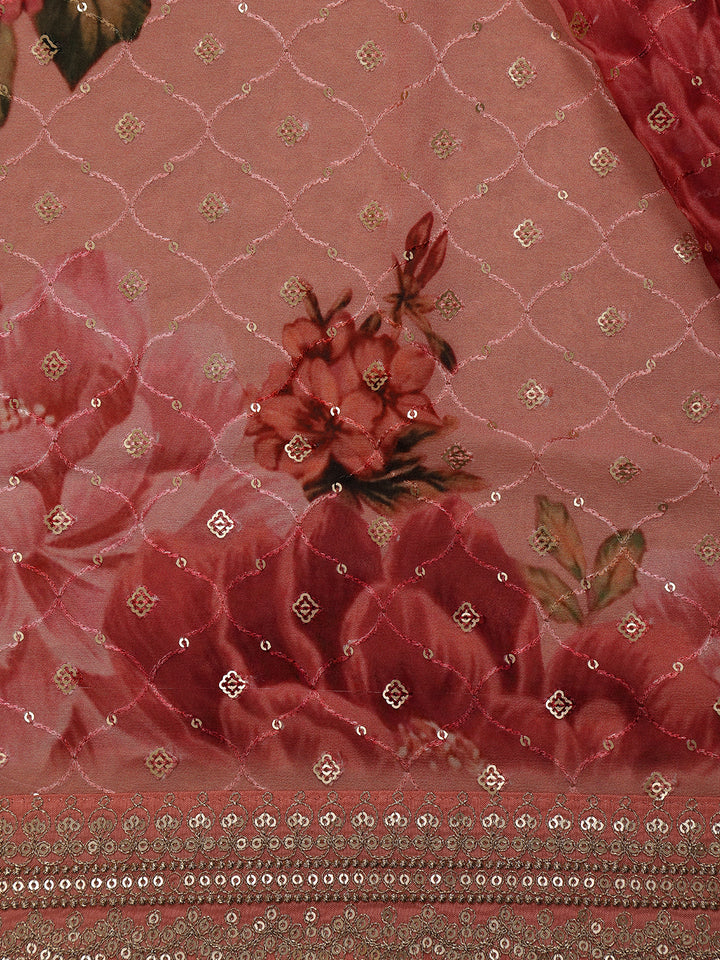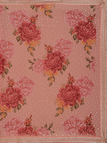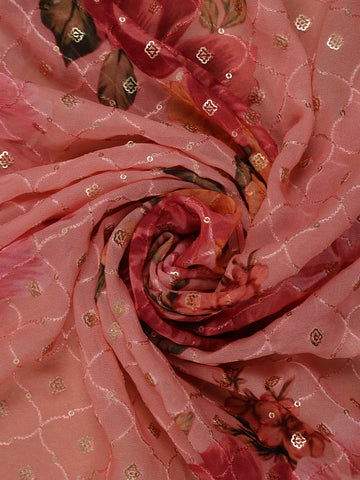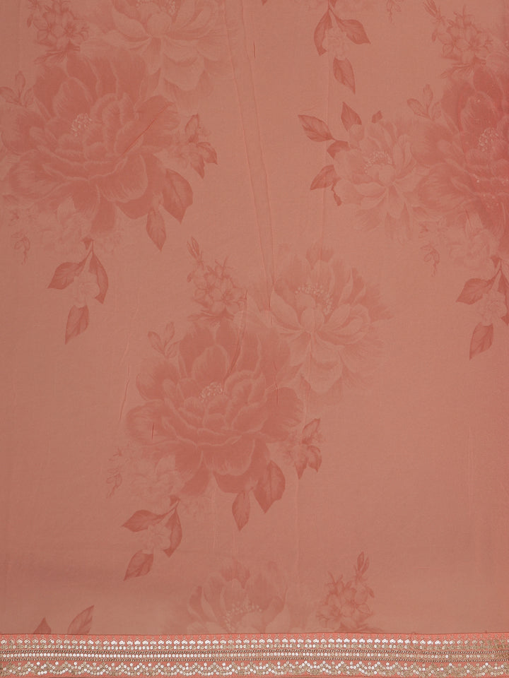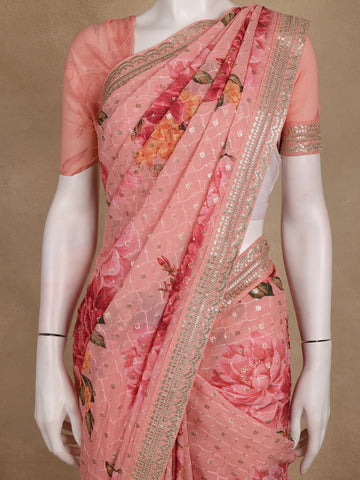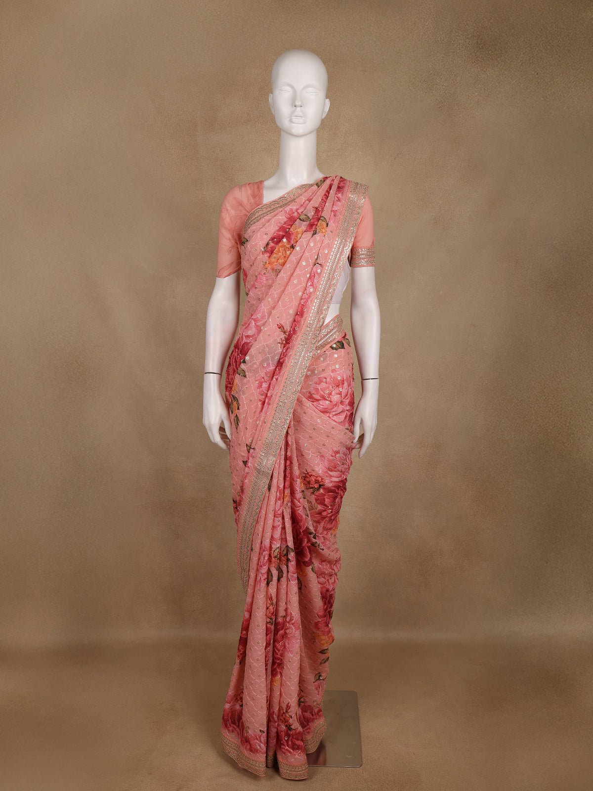 Drape yourself in elegance with this exquisite Peach Pink Georgette Saree, designed to exude grace and charm. Adorned with bold floral printed motifs in vibrant hues, the saree beautifully balances tradition with contemporary flair. The soft georgette fabric offers a lightweight, flowy drape, making it perfect for both day and evening wear.