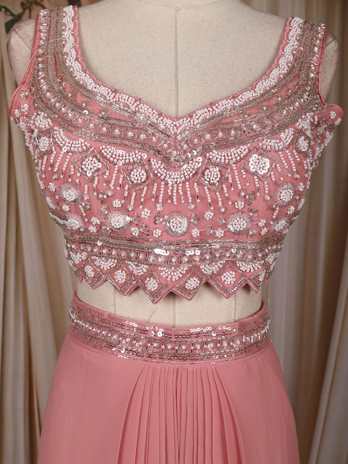 Paired with a flowy pleated georgette skirt, the ensemble creates a flattering silhouette that drapes beautifully with every movement. The highlight of this look is the cape-style jacket bordered with sparkling sequins, offering a modern alternative to the traditional dupatta and adding a touch of regal sophistication.