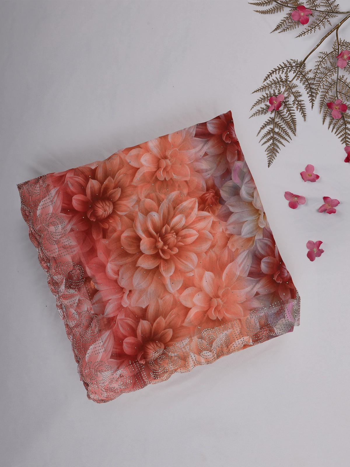 Peach Rust Floral Printed Chiffon Saree with Stone Embellished Scallop Border