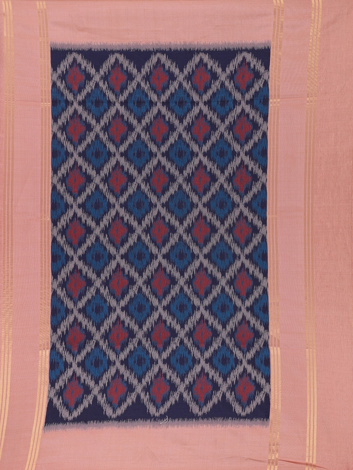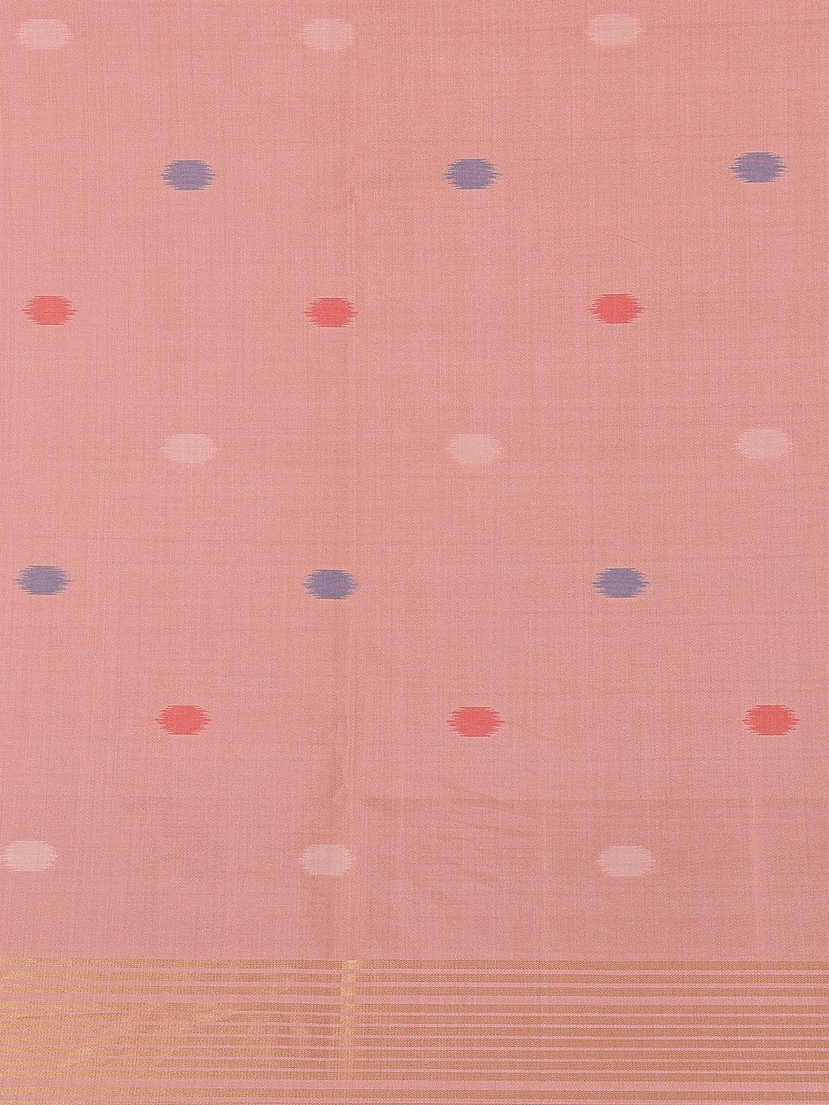 The saree features a designer printed border and a matching pallu, adding a touch of modern artistry to its traditional silhouette. Its serene peach hue lends a refined appeal that suits every skin tone, while the matching blouse piece completes the ensemble with understated grace.
