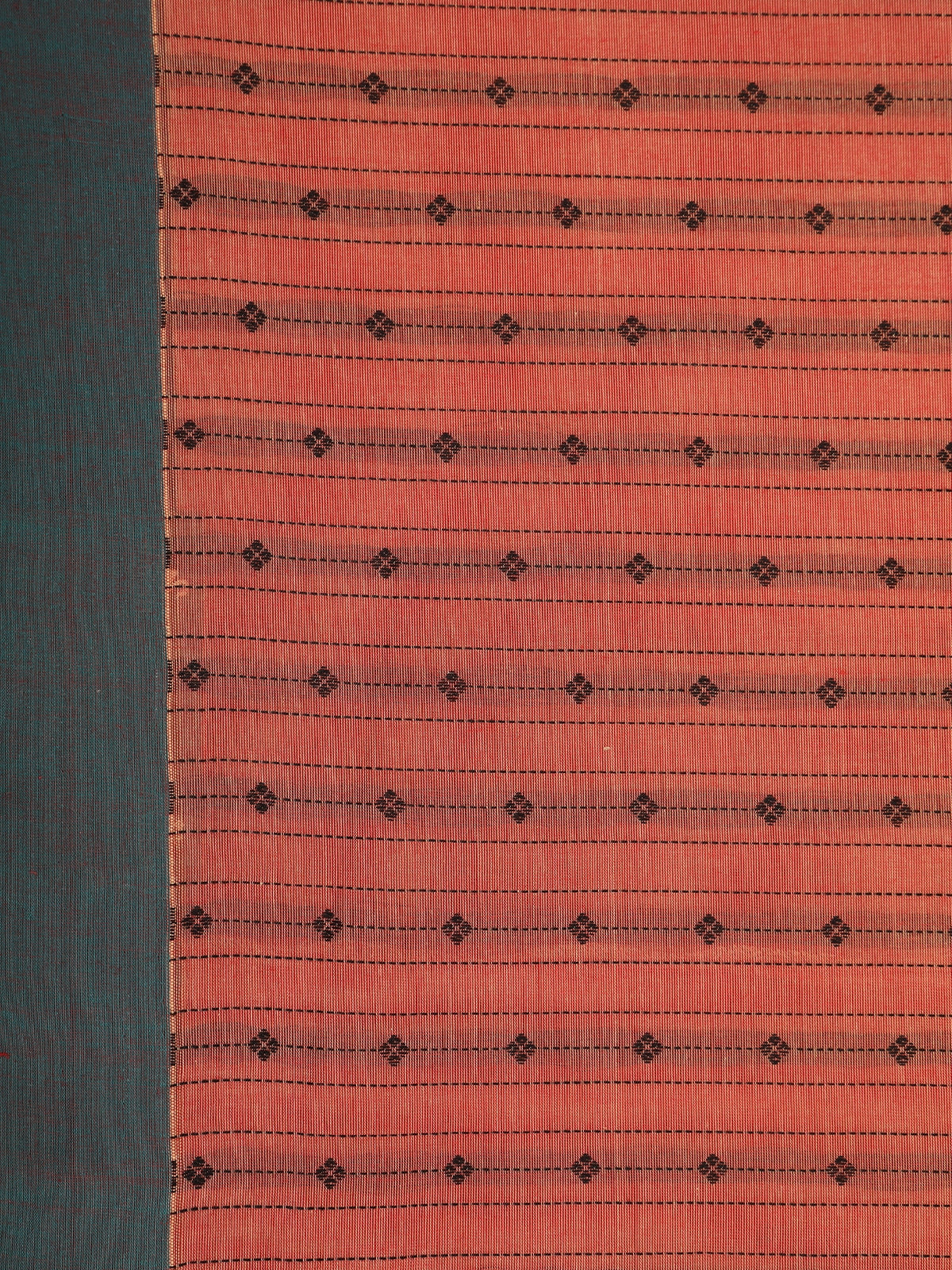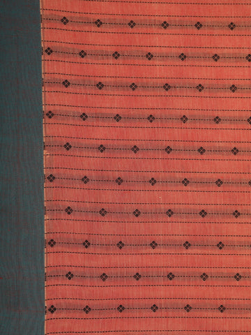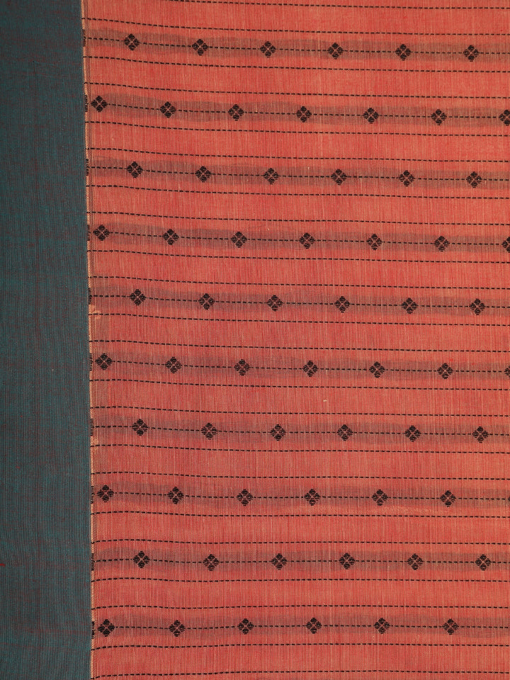 Grace your daily style with this elegant Peach Cotton Saree, featuring a finely striped weave enhanced by delicate geometric motifs across the drape. The warm peach tone gives it a fresh and feminine appeal, making it a perfect choice for workwear, casual brunches, and minimal festive looks.
