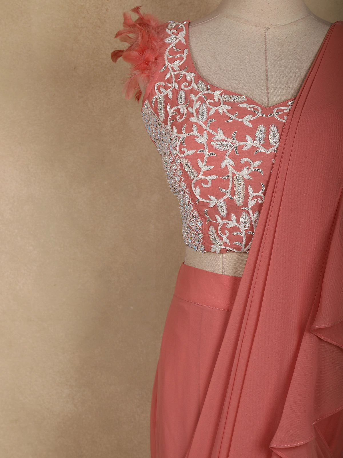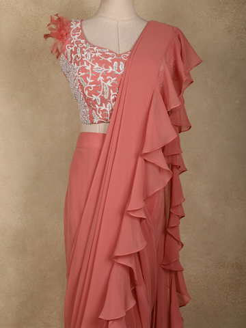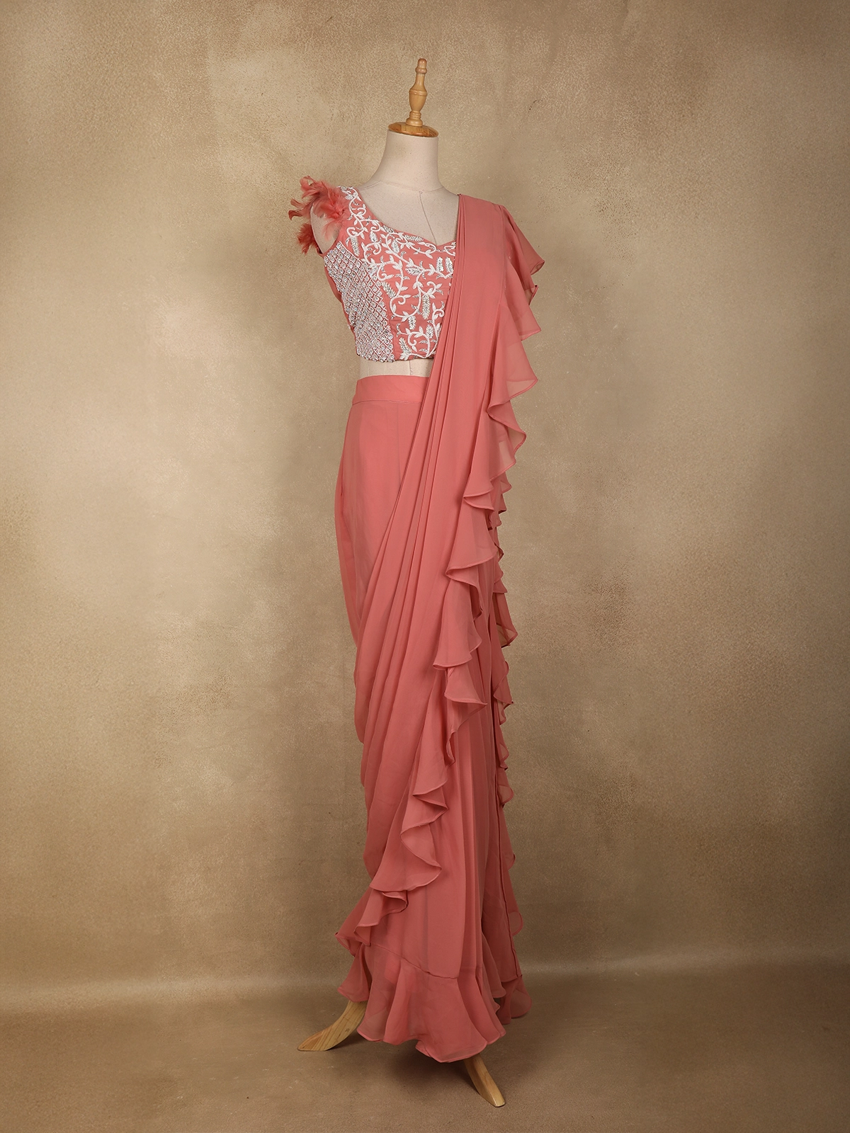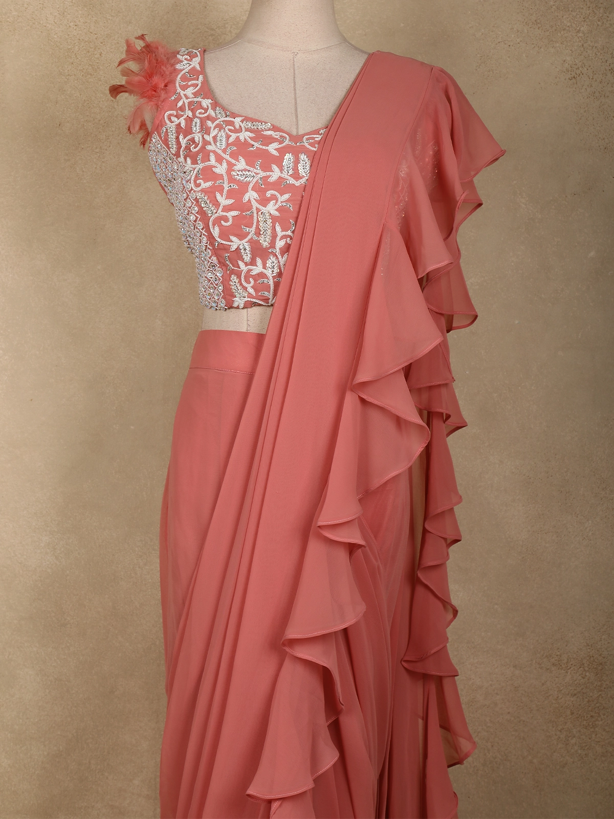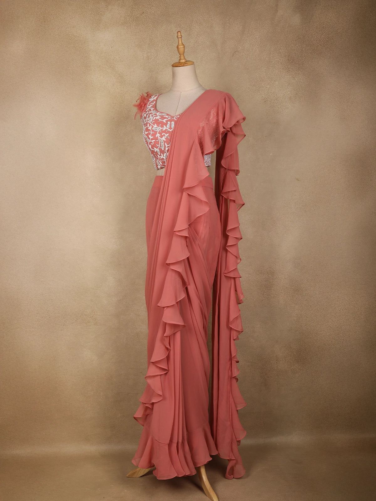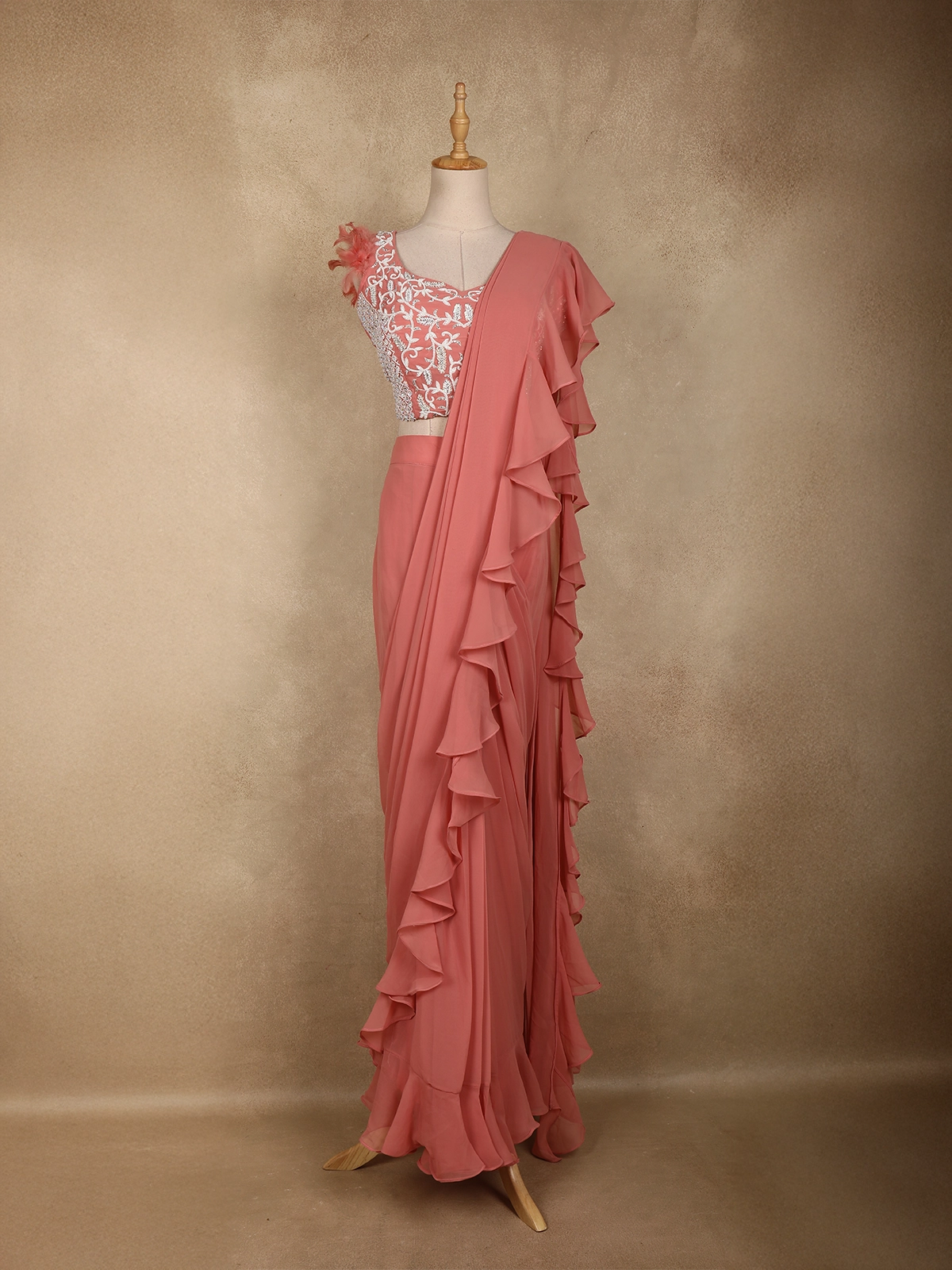 Peach Thread Embroidered Design Georgette Ready To Wear Saree with Designer Blouse