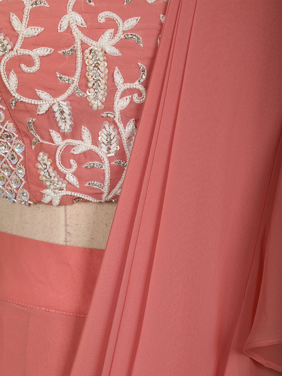 Gracefully blending modern elegance with timeless charm, this Peach Thread Embroidered Georgette Ready-to-Wear Saree is a perfect statement piece for contemporary celebrations. Crafted in lightweight georgette, the saree features a beautifully pre-stitched drape that ensures effortless wear while maintaining a flawless fall.