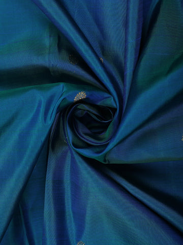 Exuding timeless elegance and regal charm, this Peacock Blue Butta Woven Design Pure Kanchipuram Silk Saree with Contrast Royal Purple Border is a true celebration of South Indian craftsmanship. Woven in luxurious pure Kanchipuram silk, the saree features a rich peacock blue body enhanced with subtle gold zari butta motifs, adding a refined sparkle without overpowering the look.
