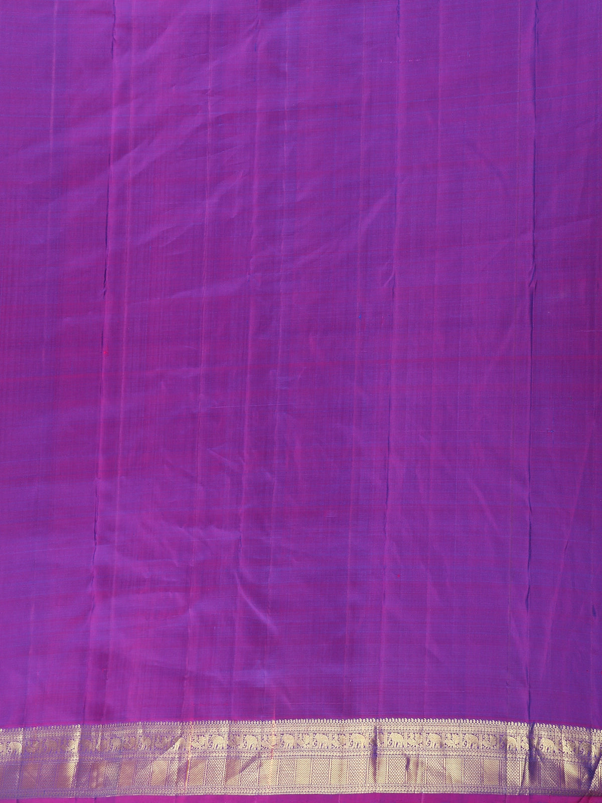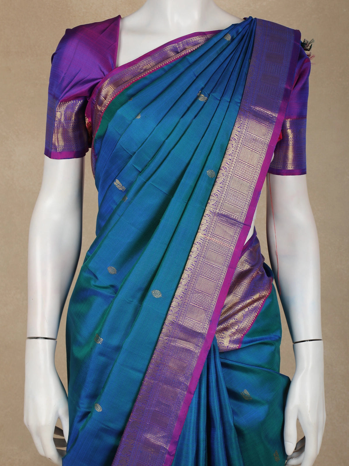 The saree is beautifully framed with a striking contrast royal purple border, intricately adorned with traditional gold zari weaving that lends grandeur and depth. The interplay of peacock blue and royal purple creates a majestic color palette, while the lustrous silk texture ensures an elegant drape and graceful fall.