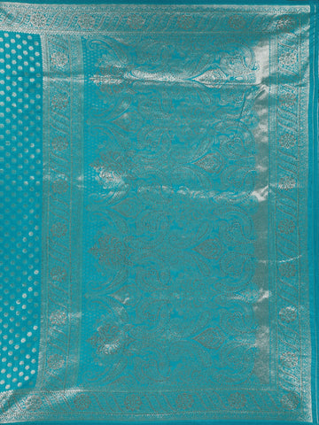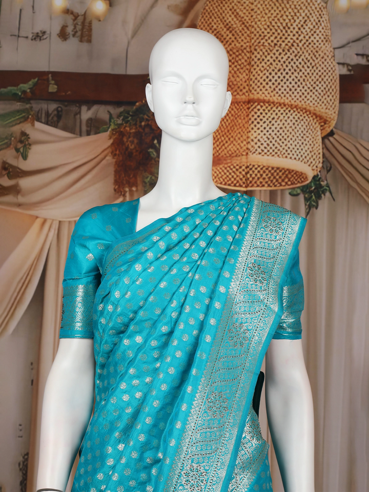 Made from luxurious semi Banarasi silk, the fabric drapes elegantly, offering a smooth texture and lightweight comfort—ideal for festive gatherings, weddings, or cultural occasions. The matching blue blouse complements the saree perfectly, while the intricately woven zari border adds a majestic finish.