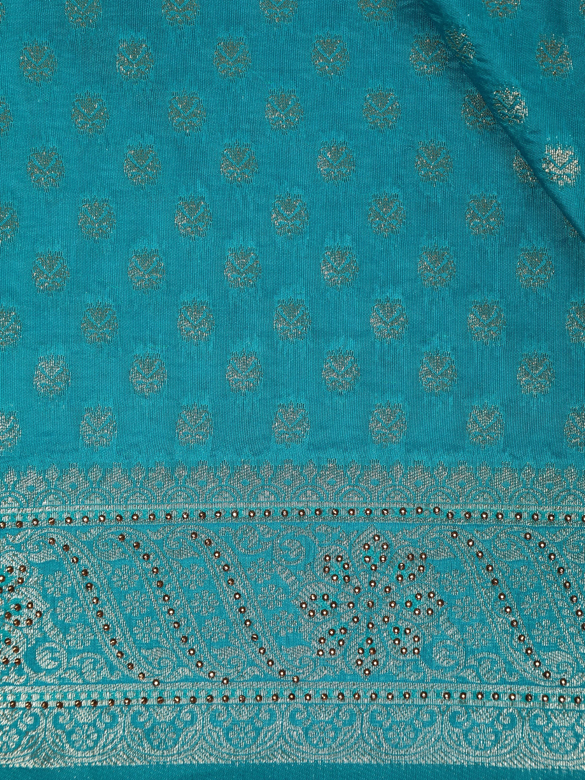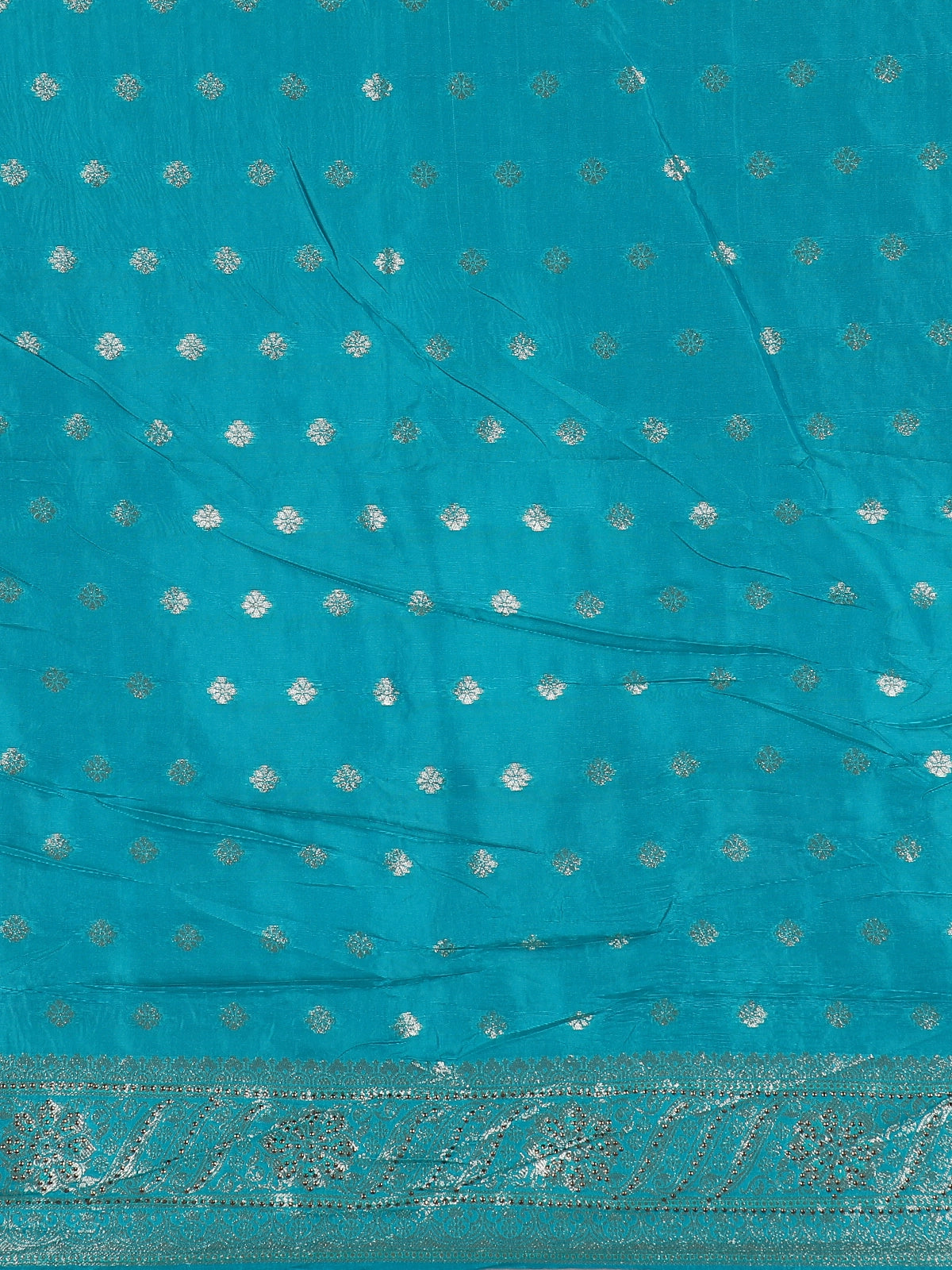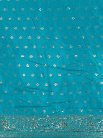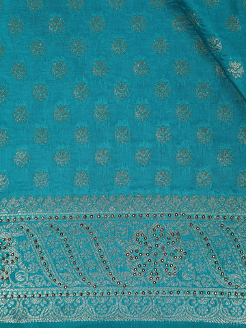 Unveil your festive charm with this Blue Semi Banarasi Silk Saree, a masterpiece that celebrates the beauty of Indian weaving traditions. The saree is adorned with delicate zari-woven floral motifs, lending a soft metallic shimmer that enhances its royal blue hue.