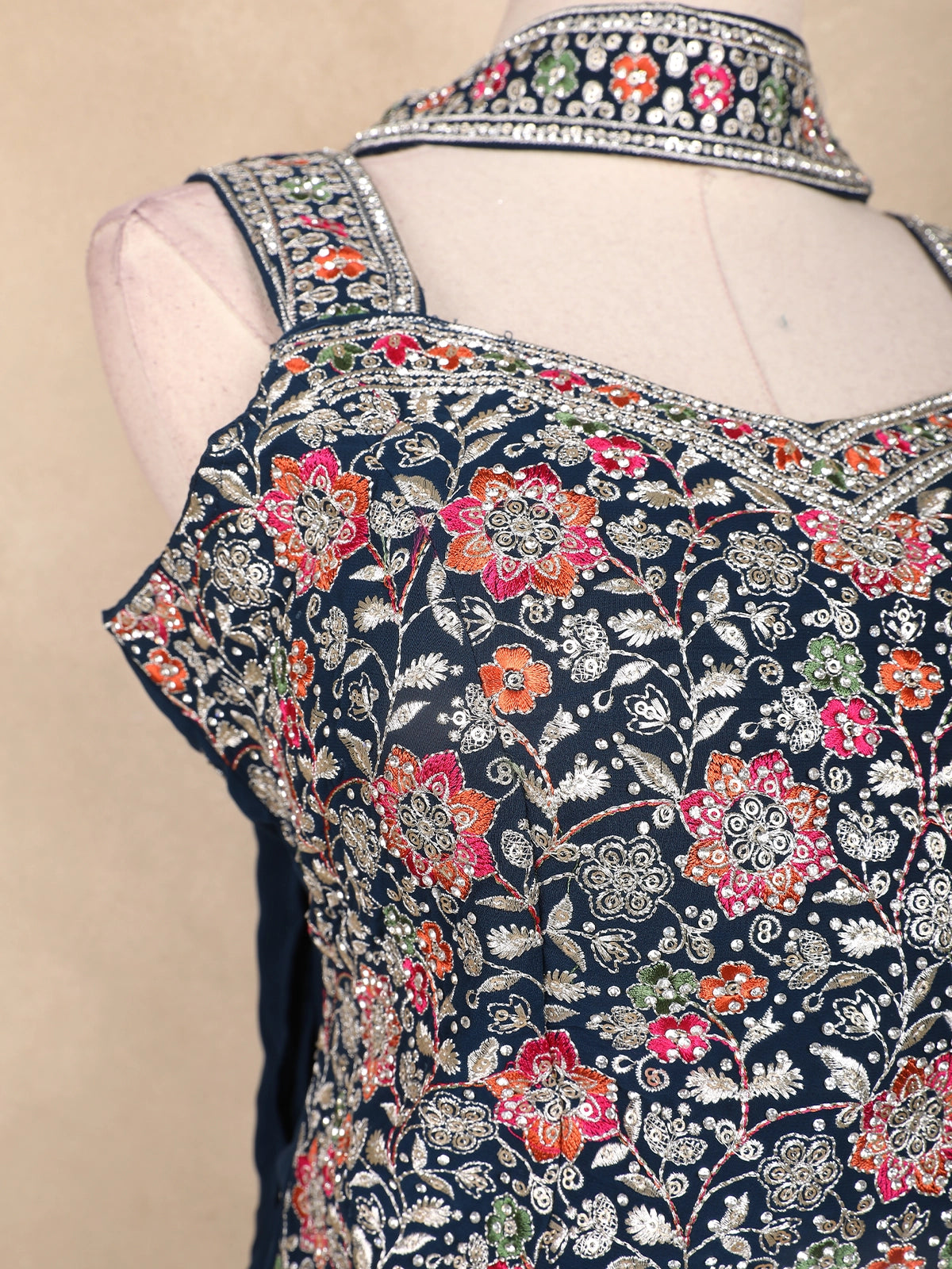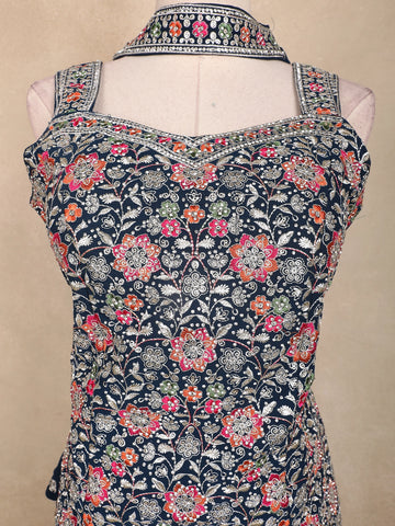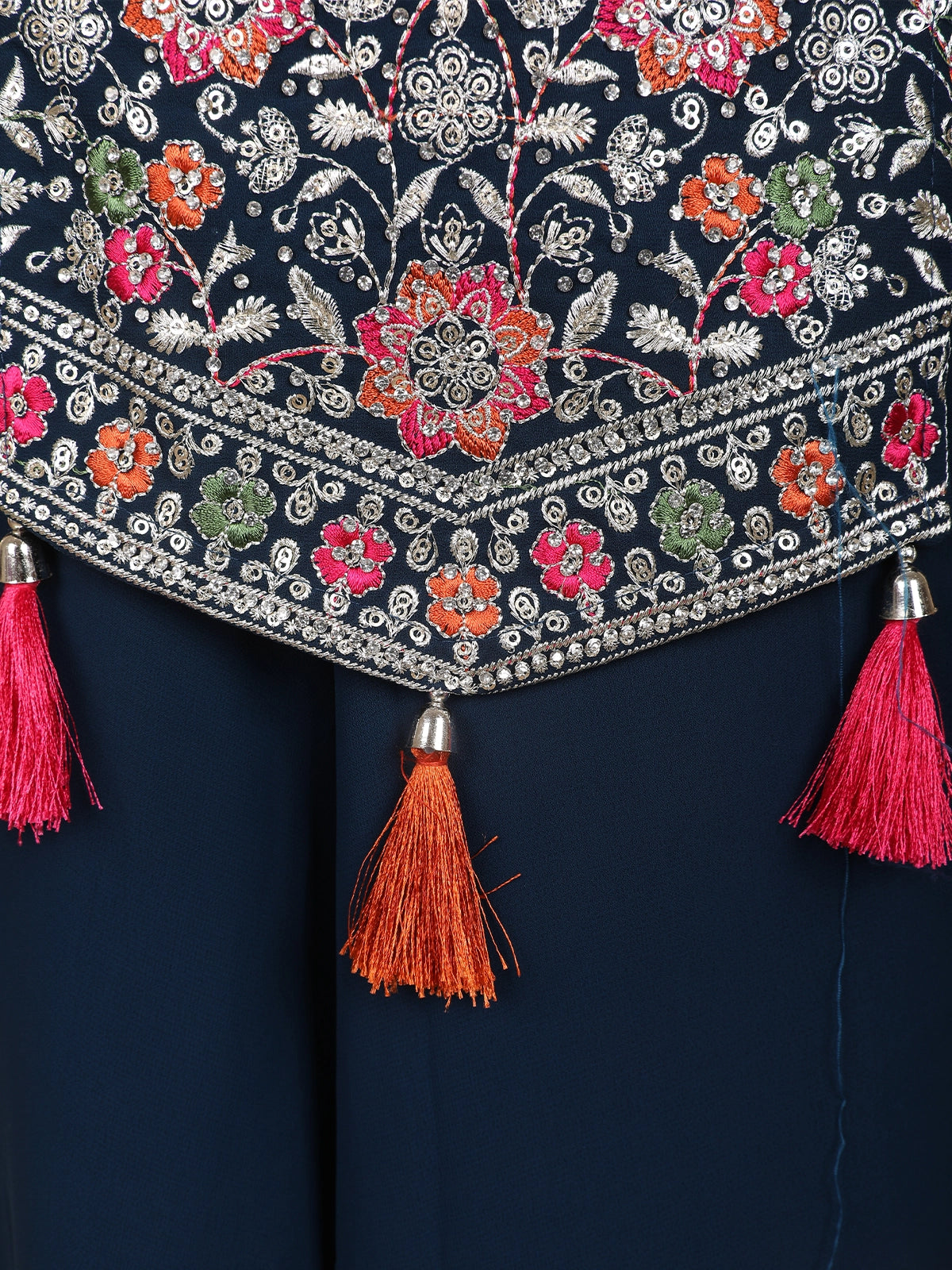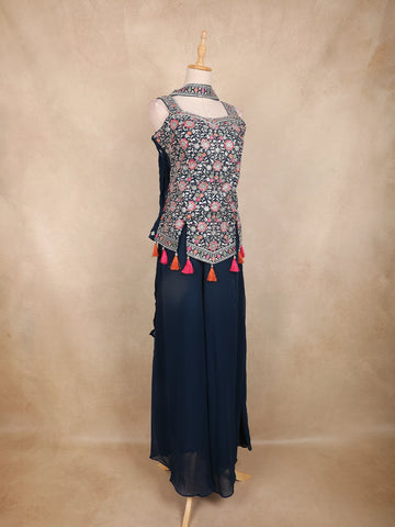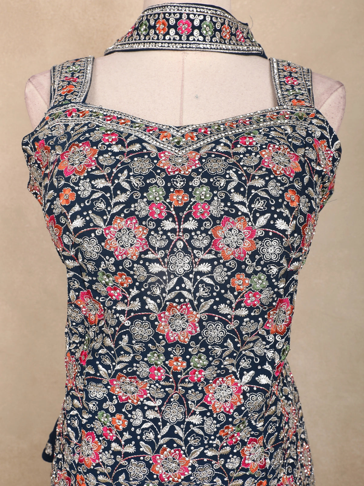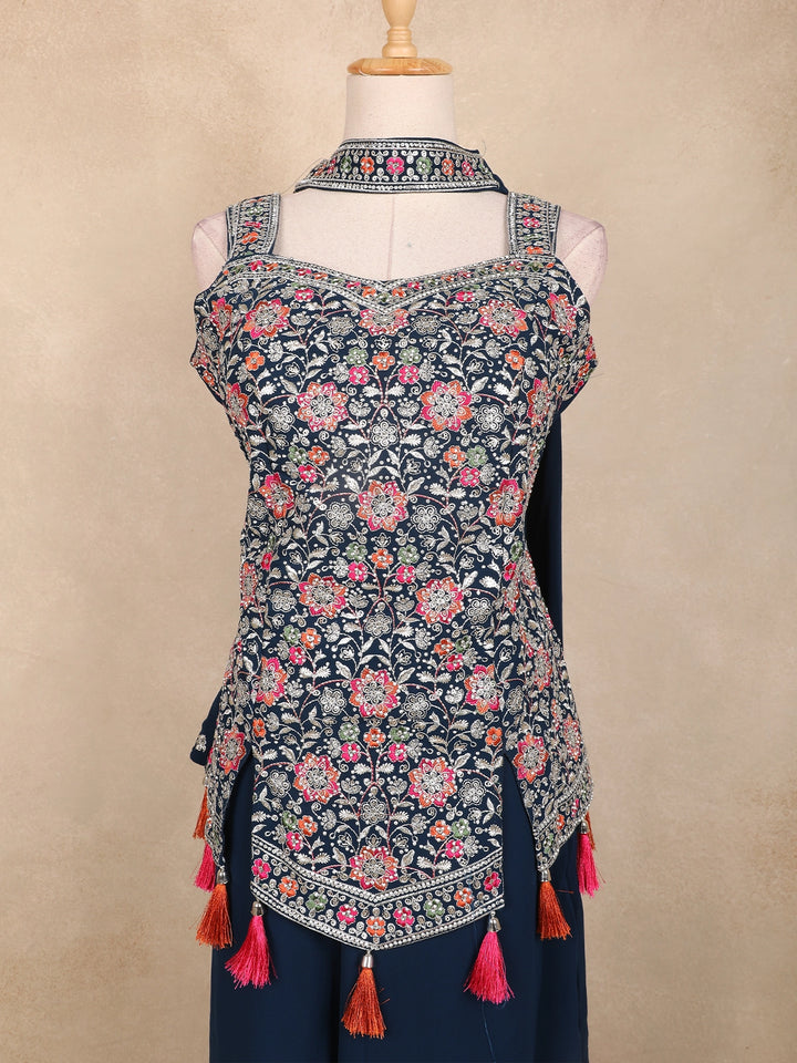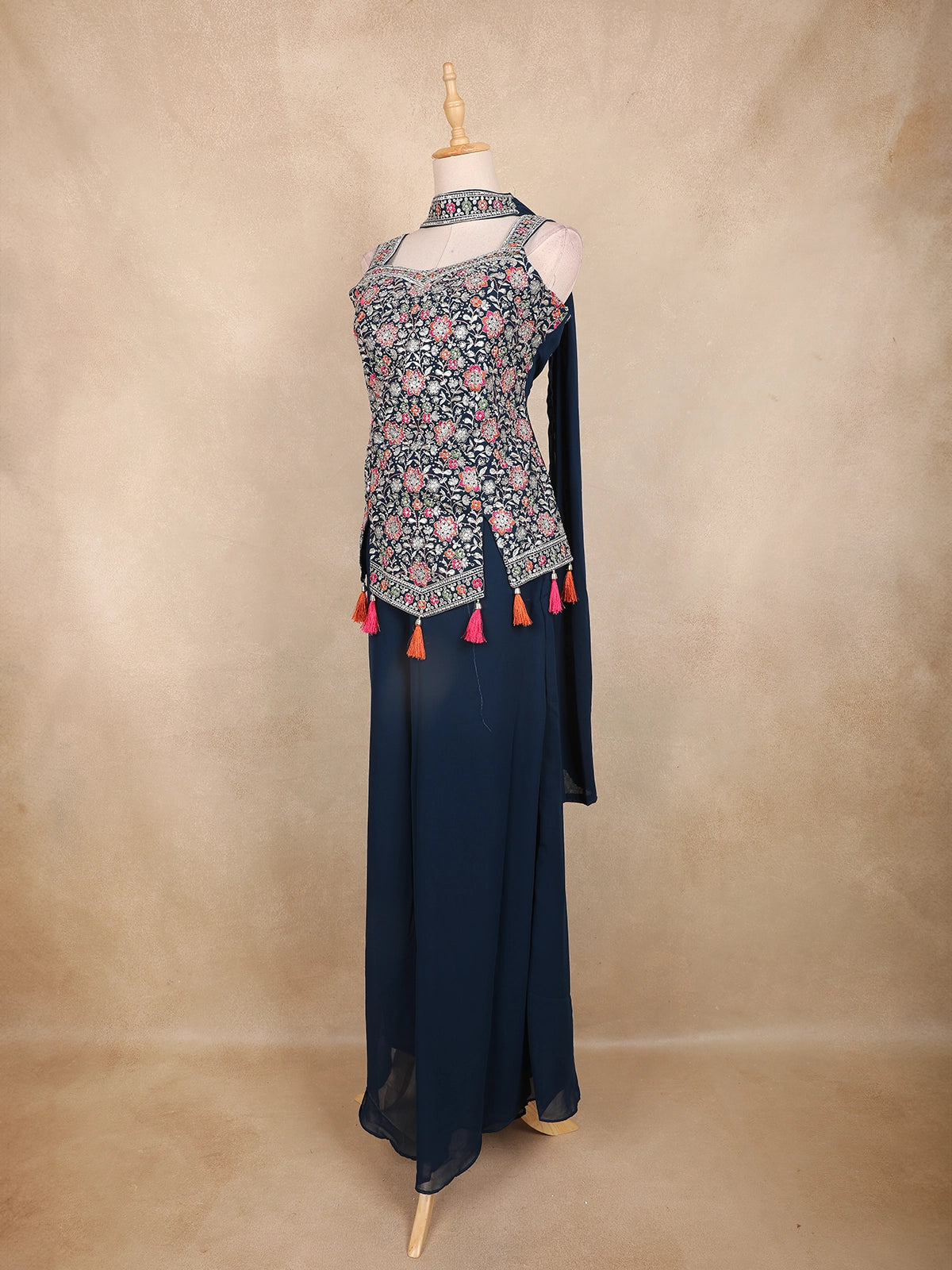 Peacock Blue Floral Embroidered Design Chiffon Palazzo Suit with Dupatta
