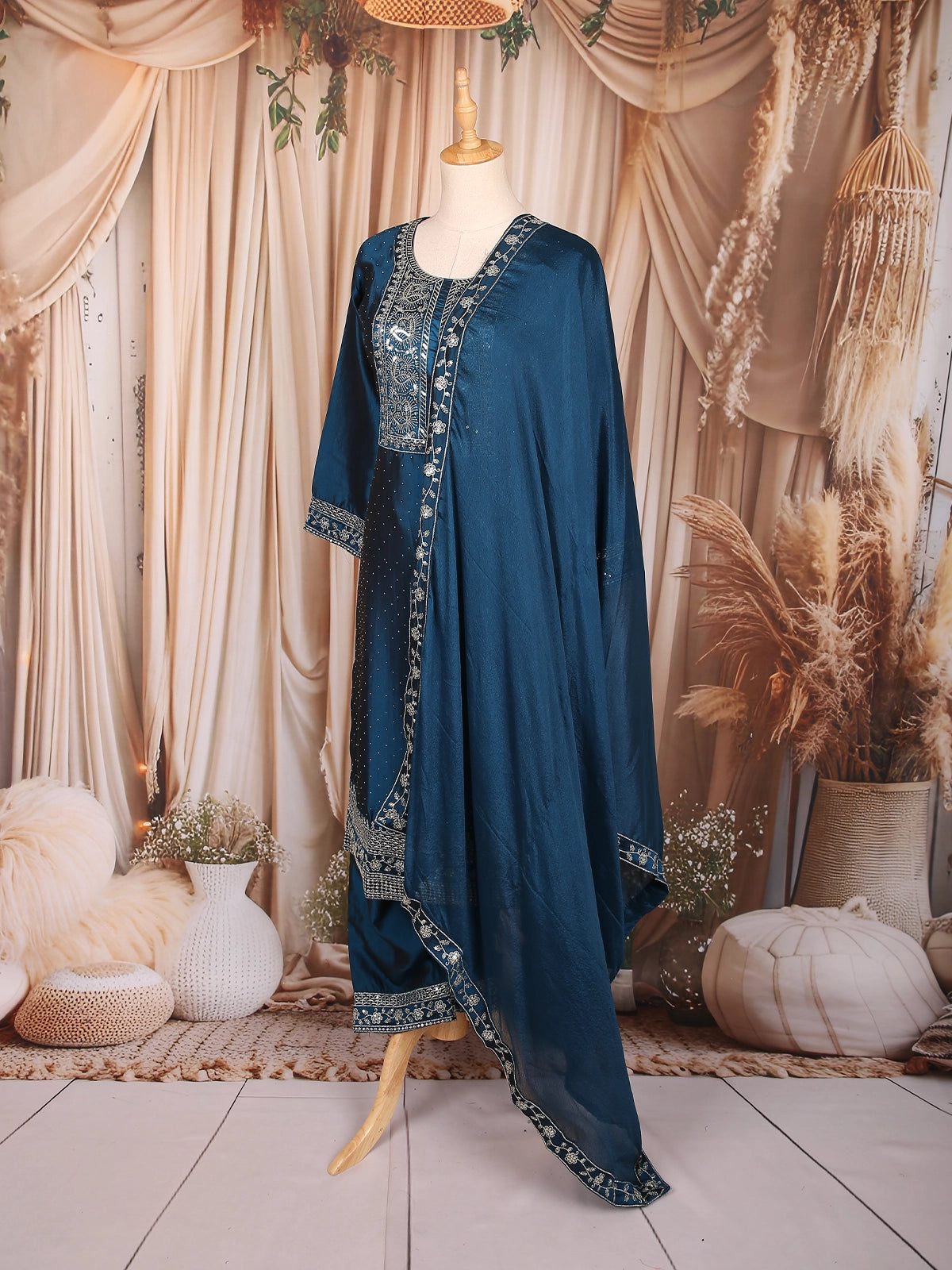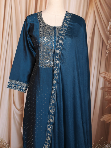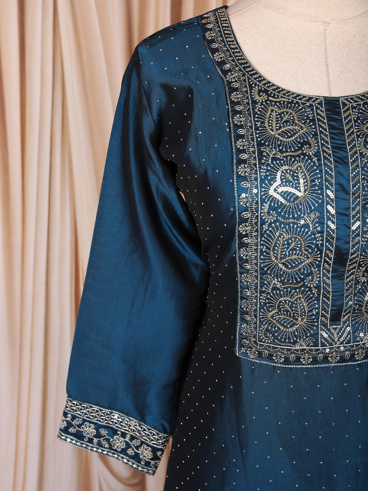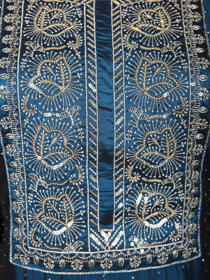Elegantly crafted in luxurious silk fabric, this Peacock blue salwar suit radiates timeless sophistication. The kurta features intricate floral thread embroidery accentuated with delicate sequin highlights along the yoke and sleeve cuffs, adding a subtle shimmer to the rich hue. The body is adorned with fine dotted patterns, enhancing its graceful charm.