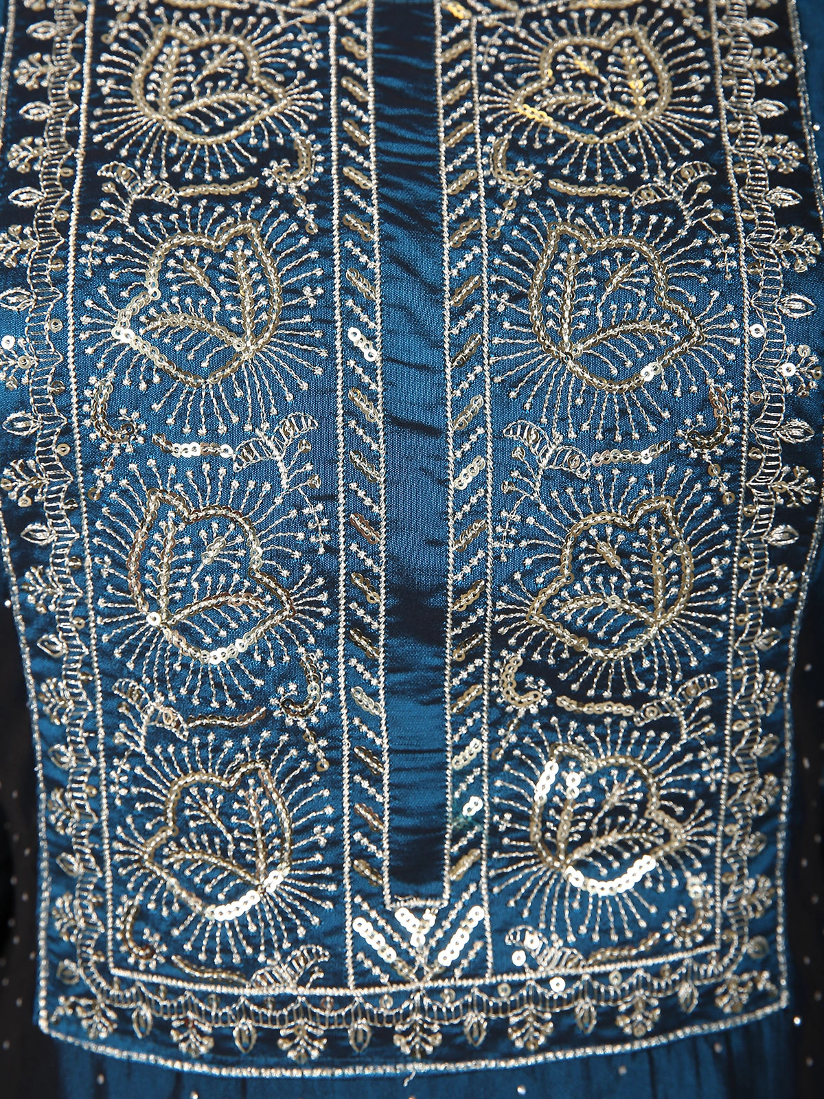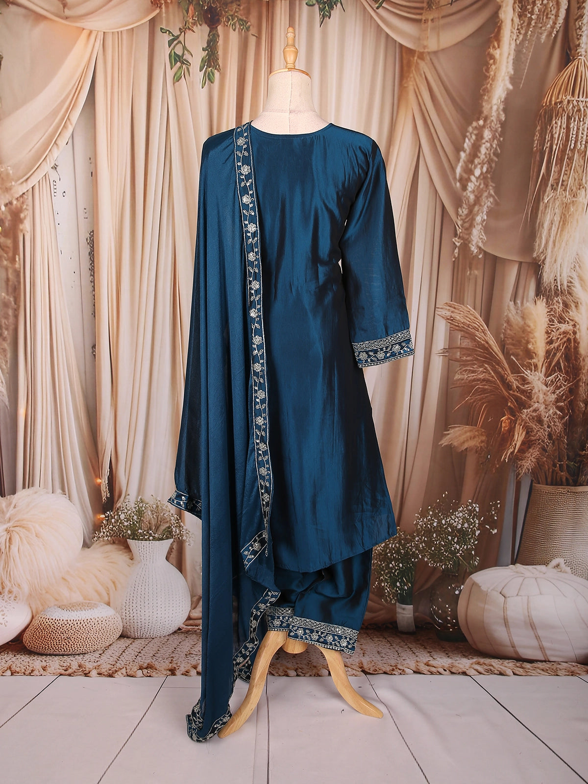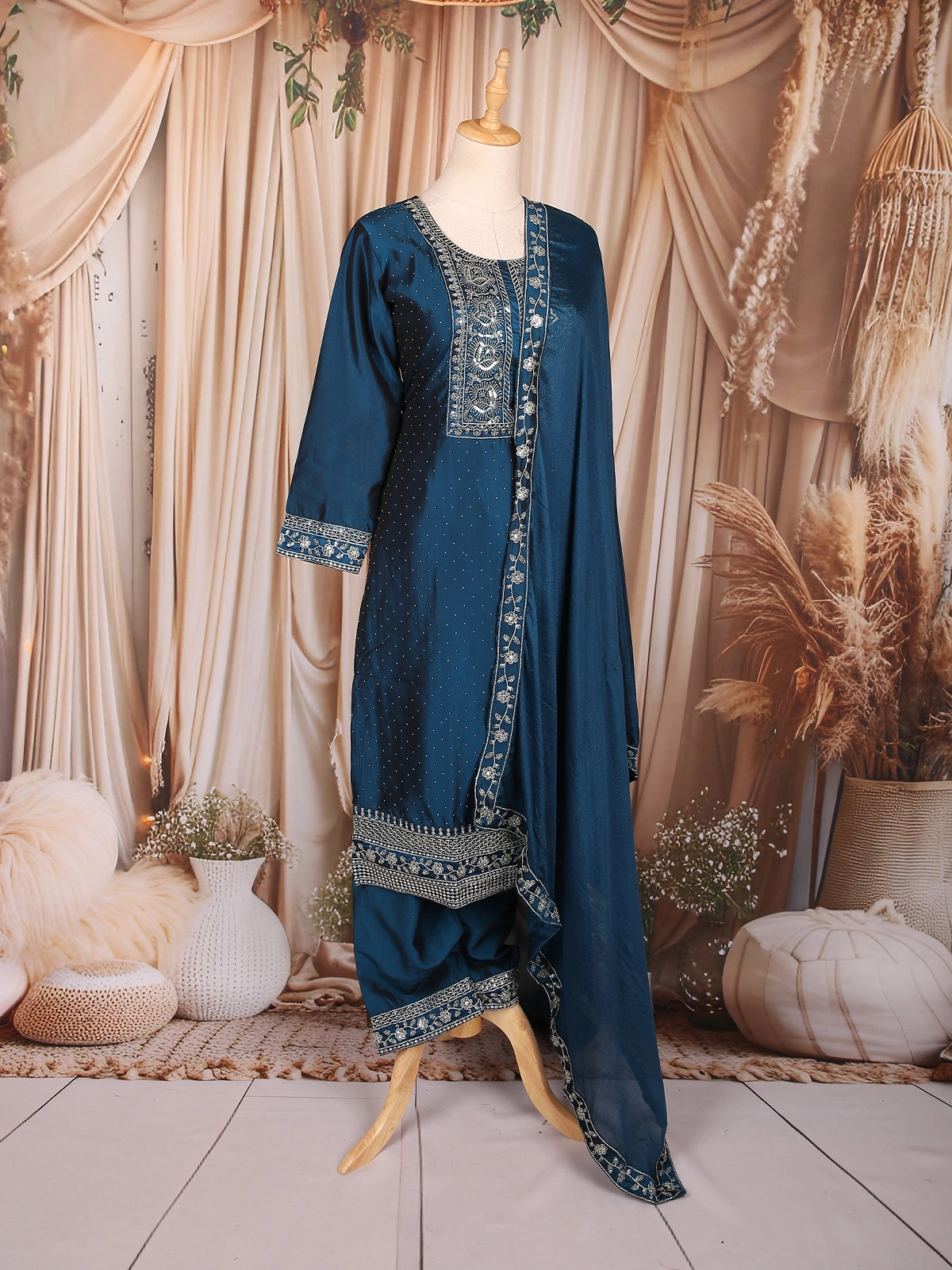 Elegantly crafted in luxurious silk fabric, this Peacock blue salwar suit radiates timeless sophistication. The kurta features intricate floral thread embroidery accentuated with delicate sequin highlights along the yoke and sleeve cuffs, adding a subtle shimmer to the rich hue. The body is adorned with fine dotted patterns, enhancing its graceful charm.