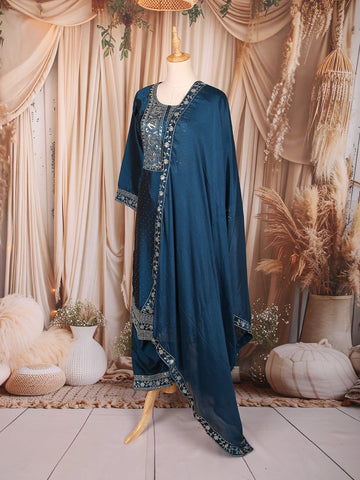 Peacock Blue Floral Embroidered Design Silk Blend Straight Cut Salwar Suit
