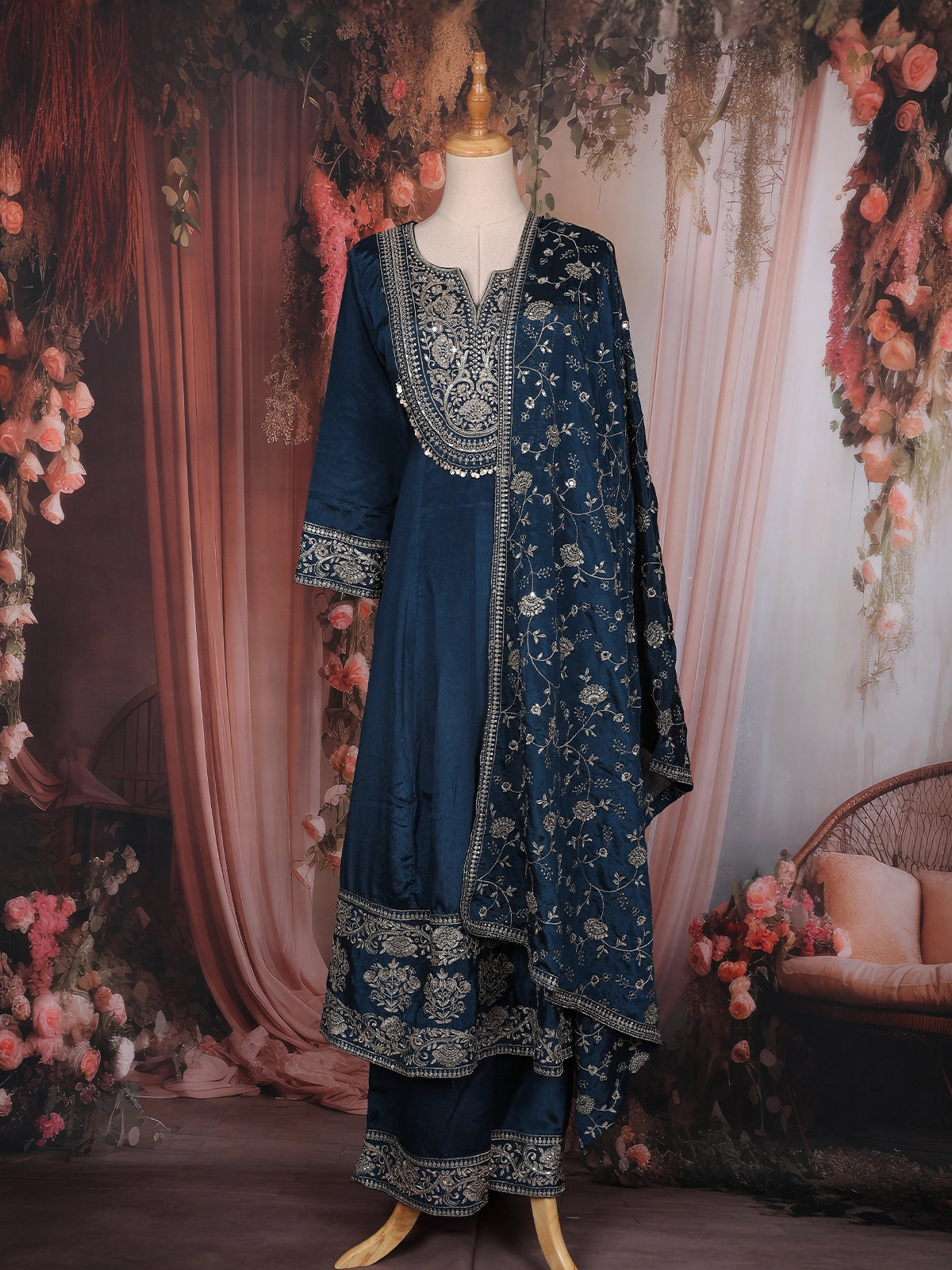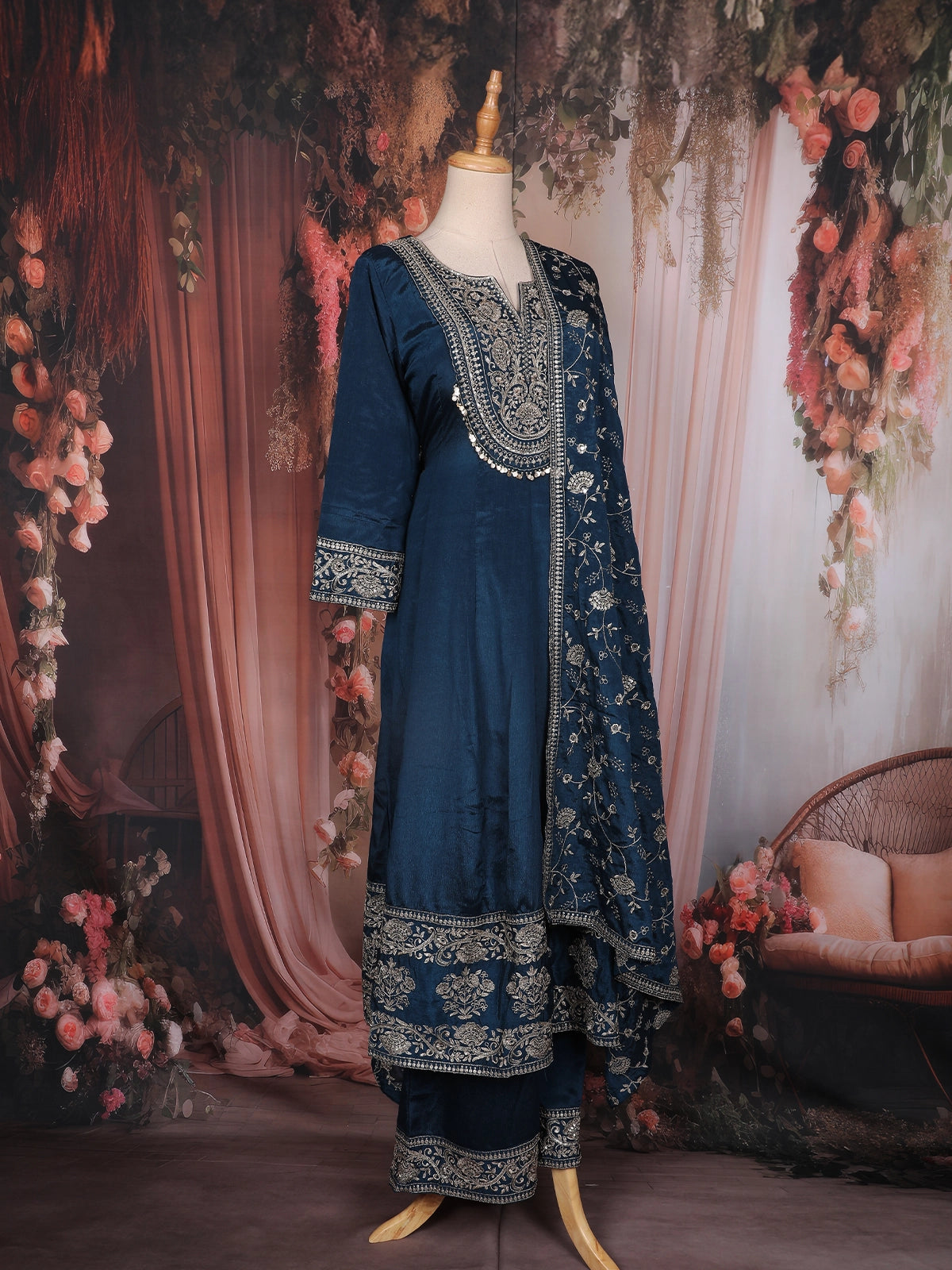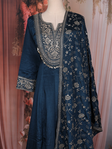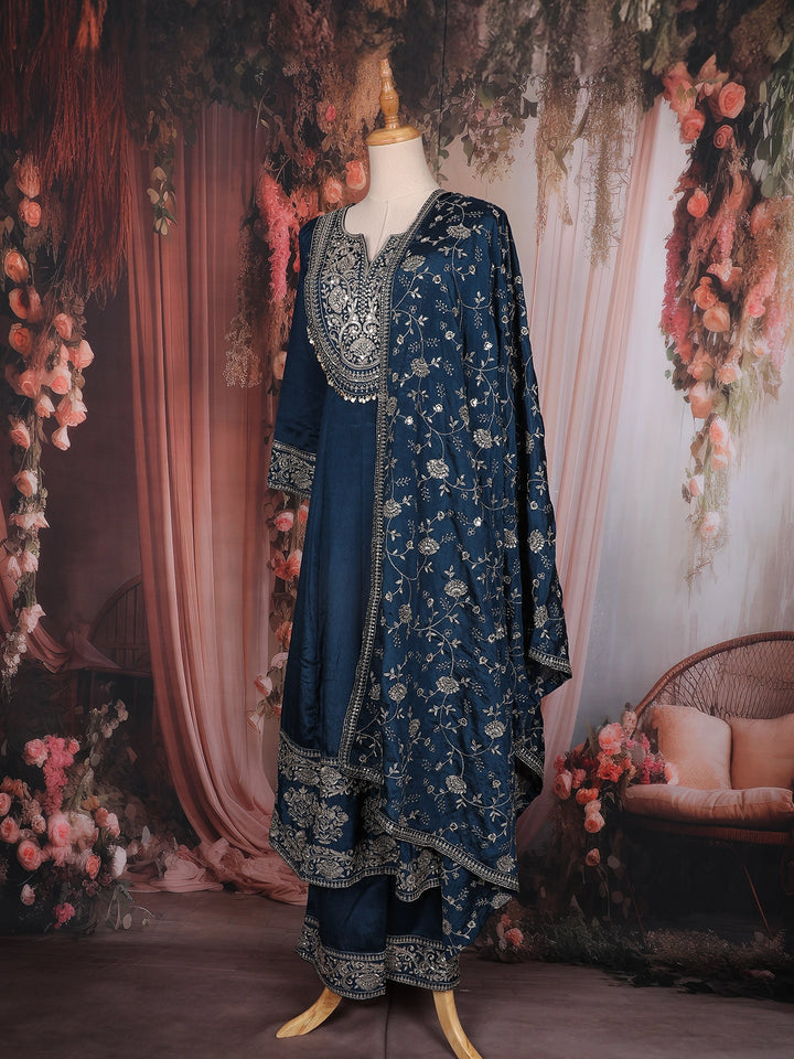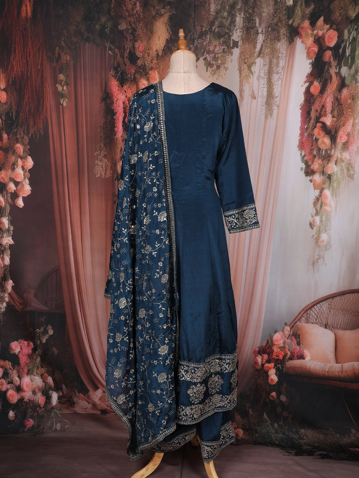 Peacock Blue Floral Embroidered Raw Silk Salwar Suit with Dupatta