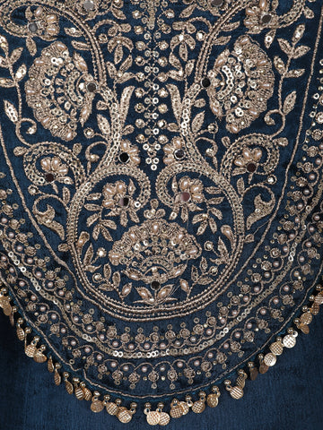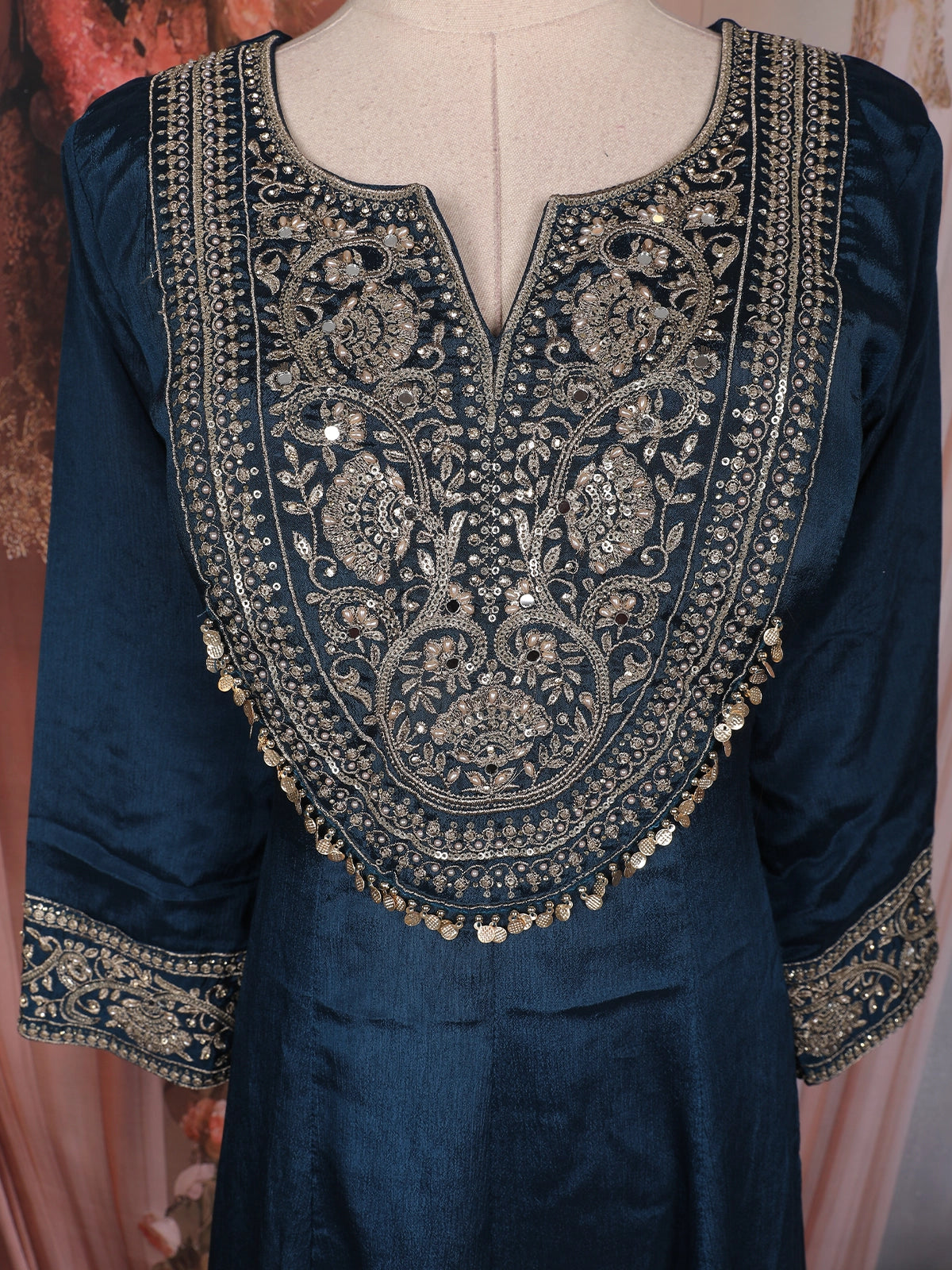 Immerse yourself in traditional elegance with this Peacock Blue Raw Silk Salwar Suit, designed to radiate regal charm. The highlight of this ensemble is the elaborately embroidered yoke panel, adorned with floral motifs, zari accents, and sequins sparkle that beautifully frames the neckline.