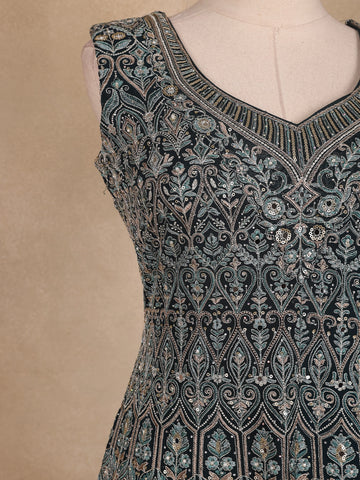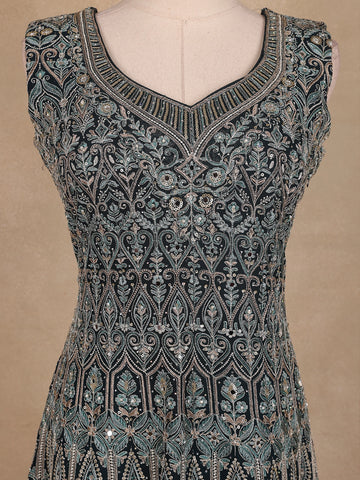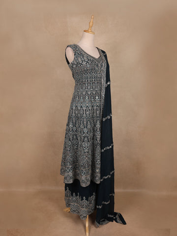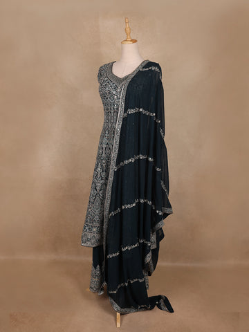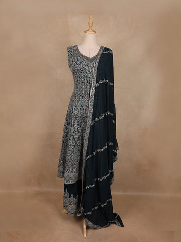 Peacock Blue Floral Sequins Embroidered Design Georgette Palazzo Suit