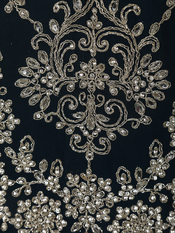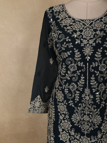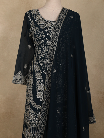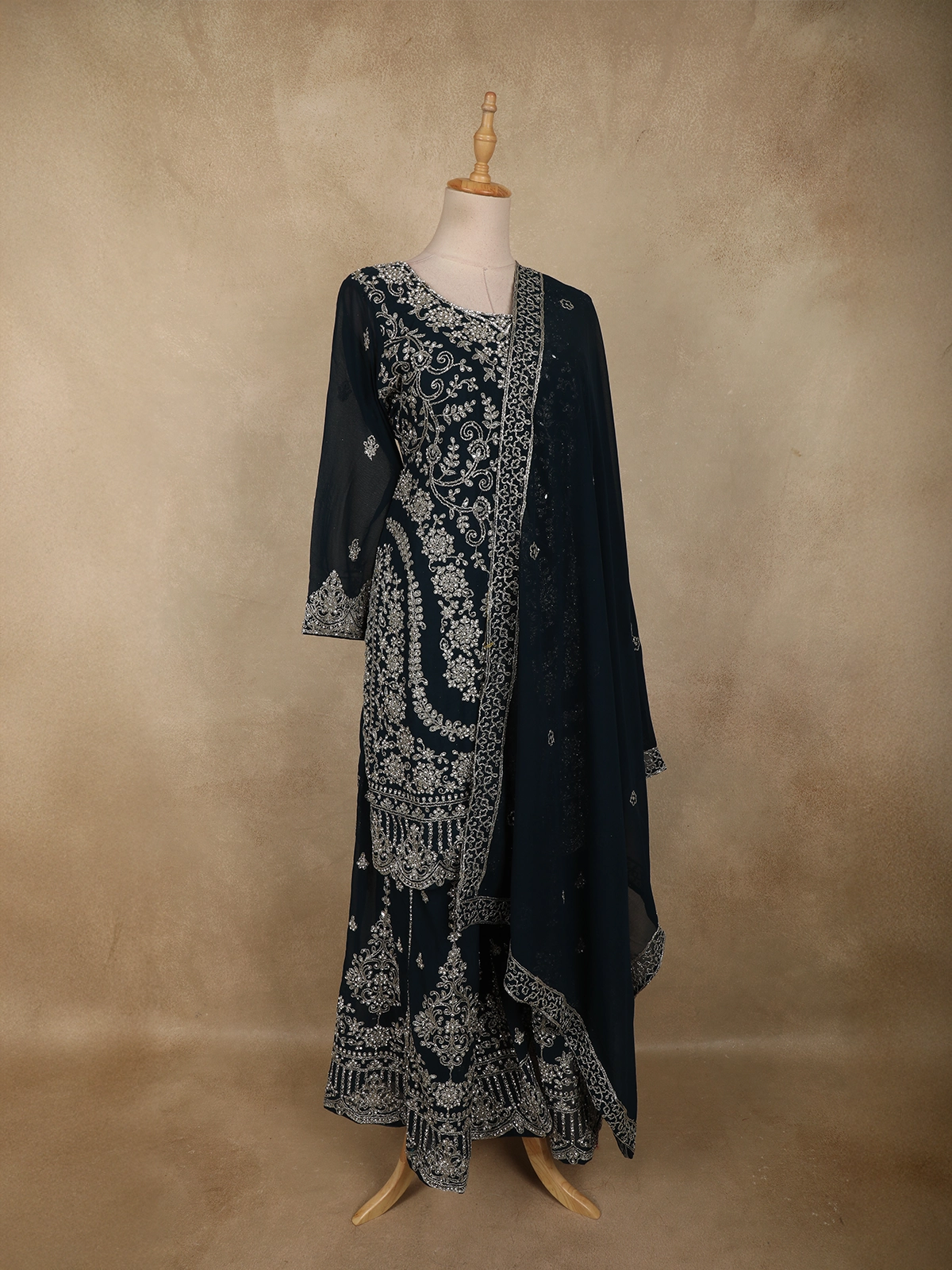 Elevate your festive wardrobe with this Peacock Blue Floral Zari Embroidered Georgette Palazzo Suit with Dupatta, a perfect blend of elegance, comfort, and timeless craftsmanship. Rendered in a rich deep teal green hue, this ensemble exudes understated luxury, beautifully enhanced with intricate floral zari embroidery.