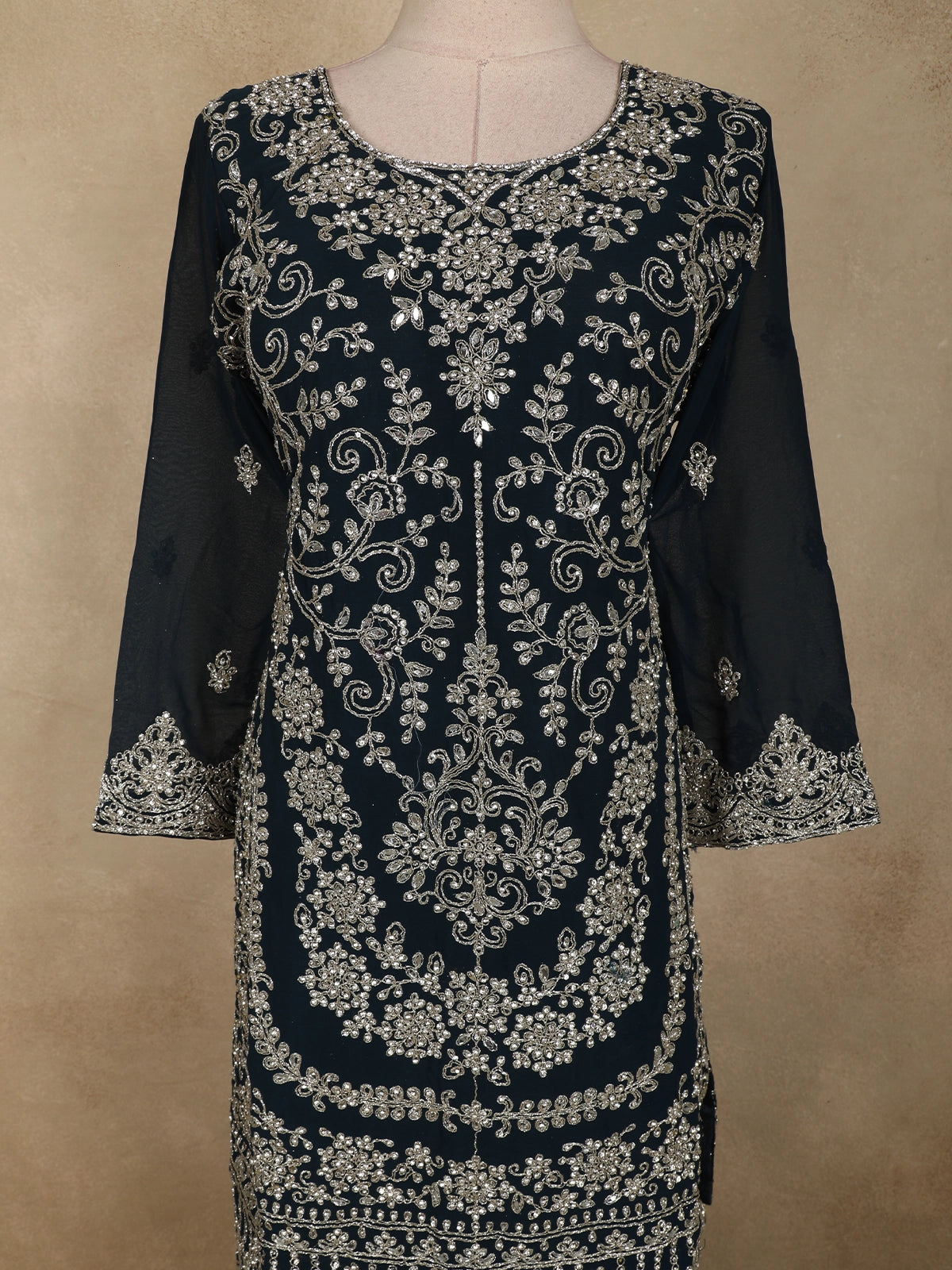 Paired with a matching georgette palazzo, adorned with ornate embroidered borders, the outfit creates a cohesive and polished look. The ensemble is completed with a coordinated dupatta, embellished with delicate motifs and a zari-embroidered edge that drapes effortlessly for a regal finish.