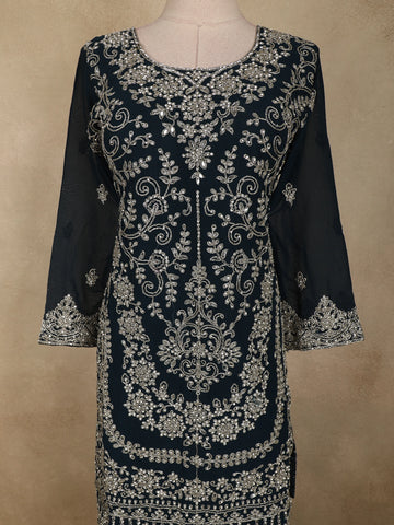 The georgette kurti features finely detailed floral motifs woven with shimmering zari work, gracefully adorning the neckline, yoke, sleeves, and hem. The straight-cut silhouette offers a flattering fit while maintaining ease of movement, making it ideal for extended celebrations. Delicate embroidery accents on the three-quarter sleeves add a refined touch to the overall design.