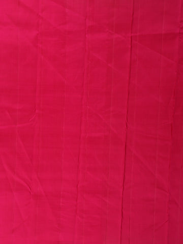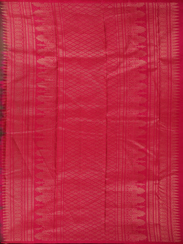 A refined contrast border highlighted with traditional zari detailing frames the saree elegantly, while the coordinated zari-woven pallu completes the classic Kanchipuram aesthetic. Paired with a striking contrast blouse in a vibrant pink tone, the ensemble gains a beautiful pop of colour that elevates its festive charm.