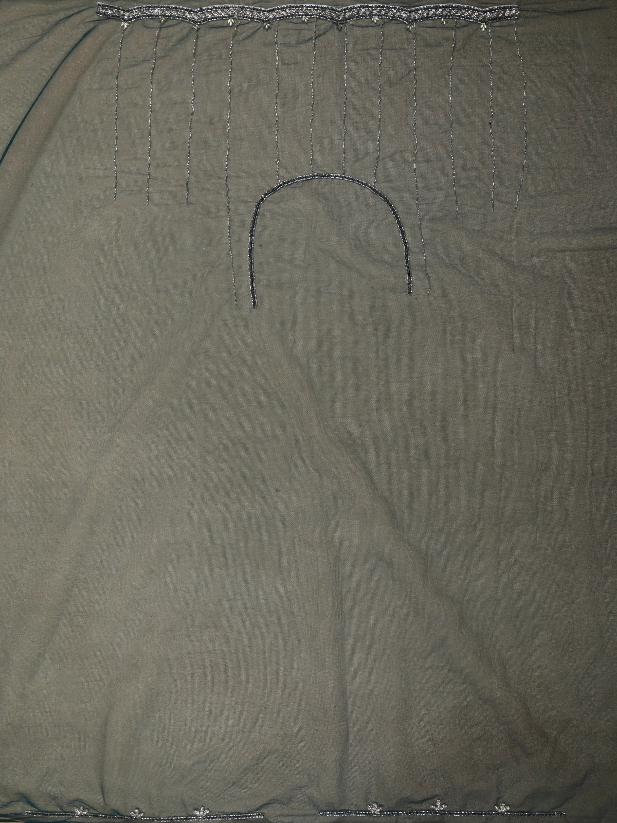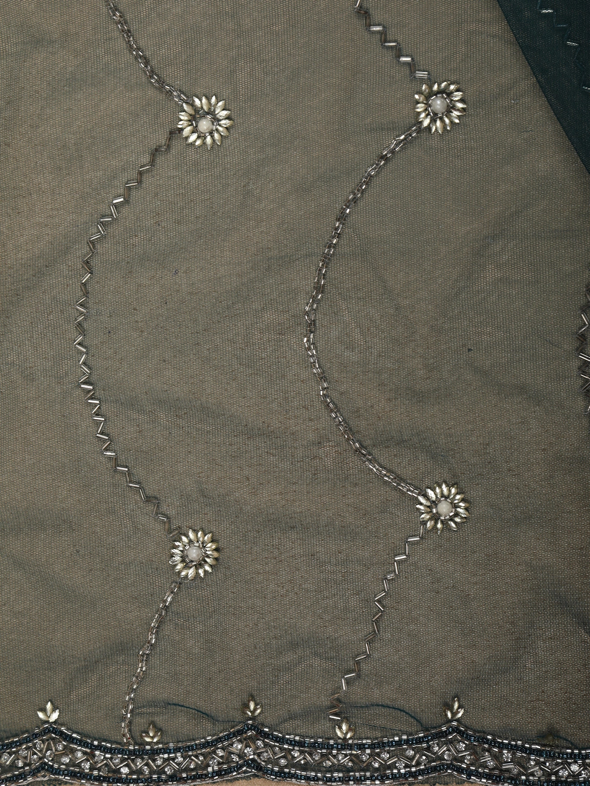 The saree is beautifully embellished with sequins and bead embroidery, arranged in delicate floral and wave-inspired patterns that shimmer subtly under light. Fine detailing along the border adds definition while maintaining a soft, elegant finish. The interplay of the translucent net base with the intricate embellishments gives the saree a modern, couture-inspired appeal.