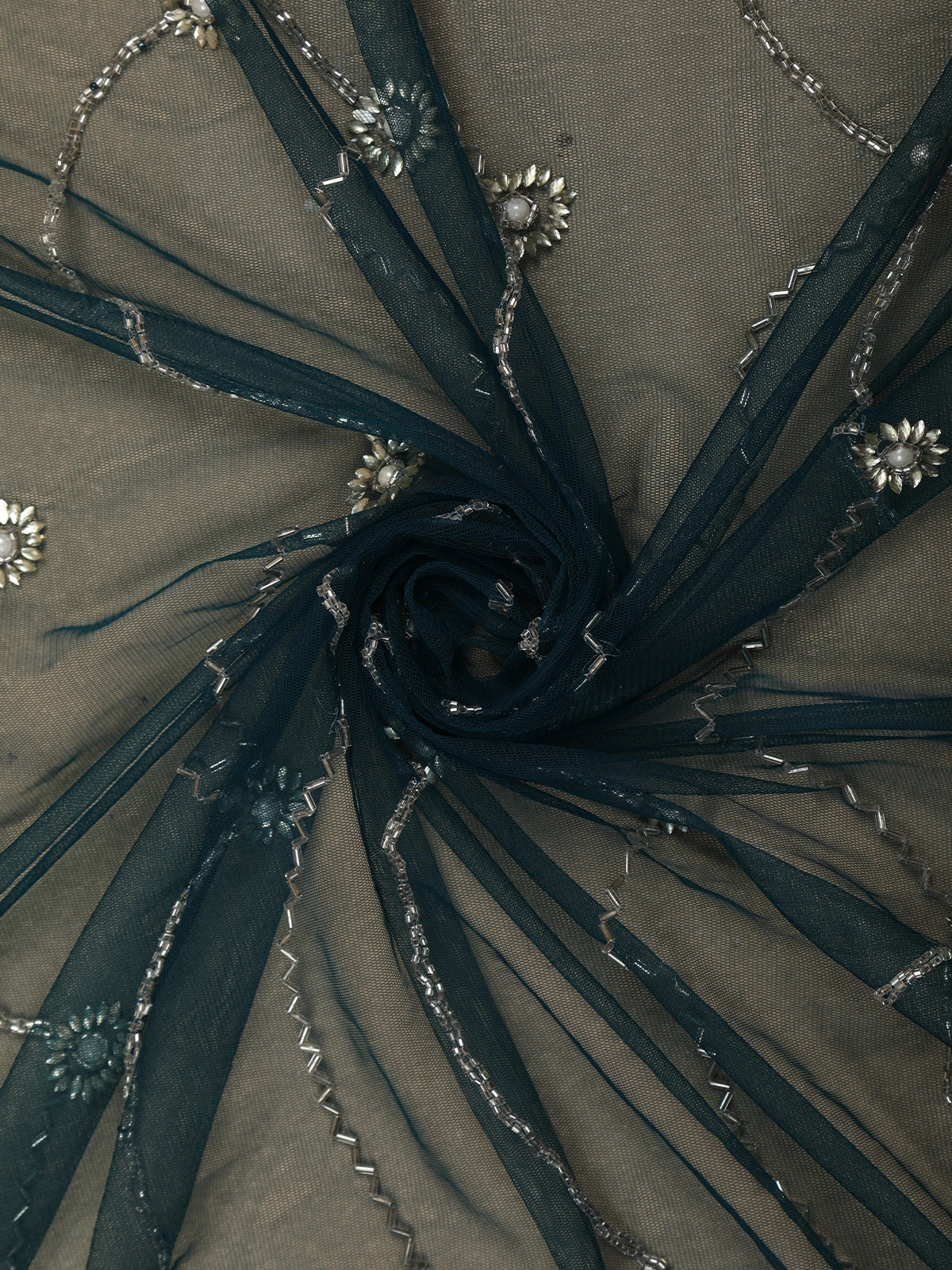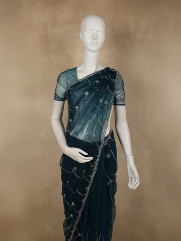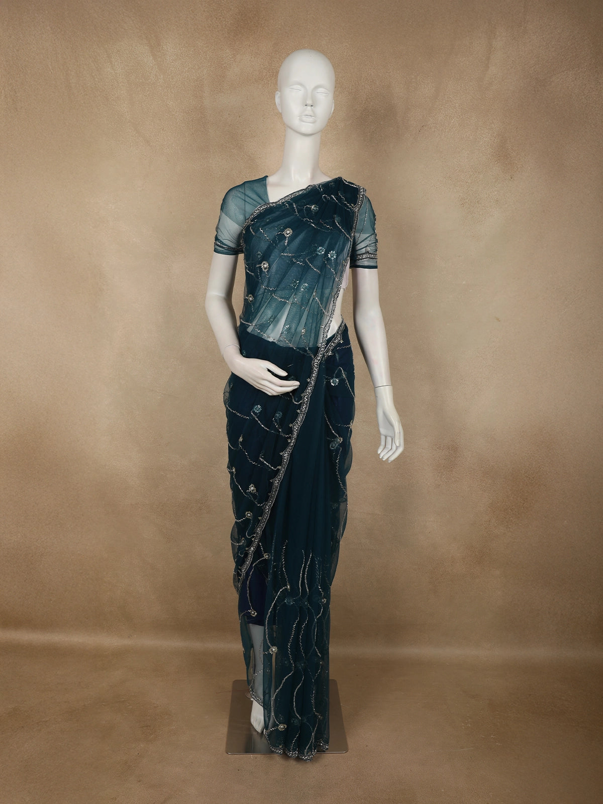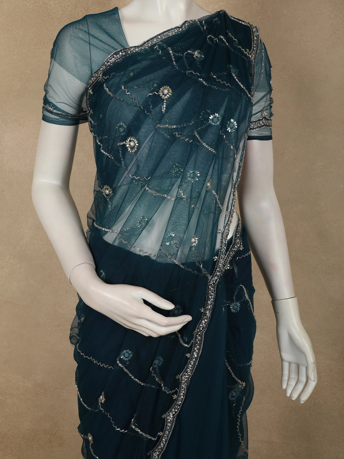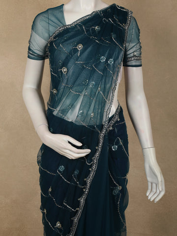 Peacock Blue Sequins and Beads Embroidered Design Net Designer Saree