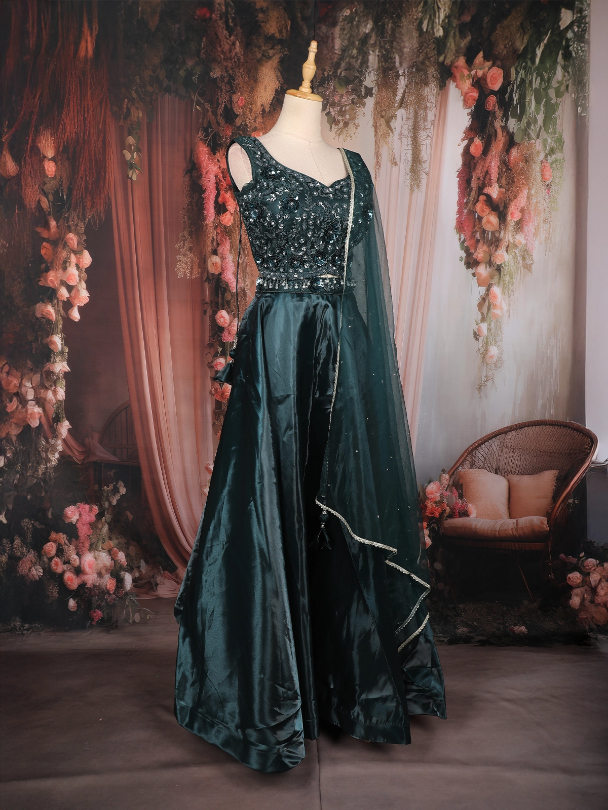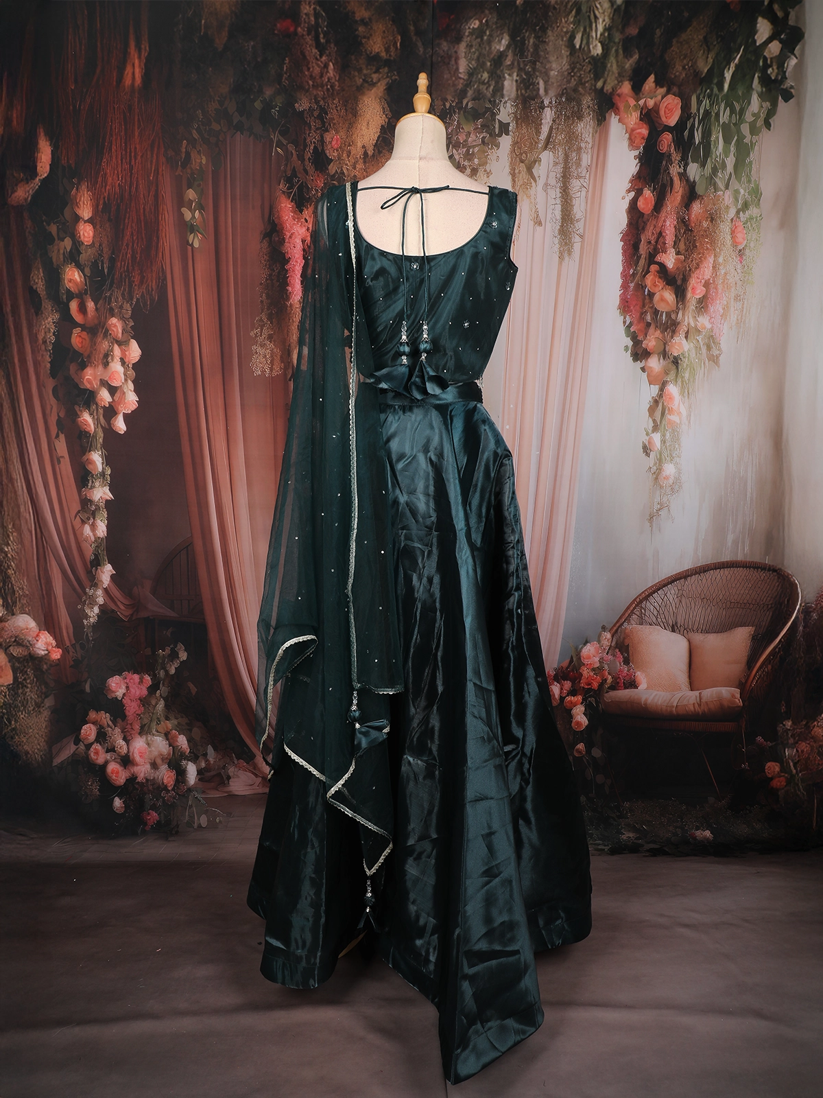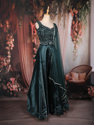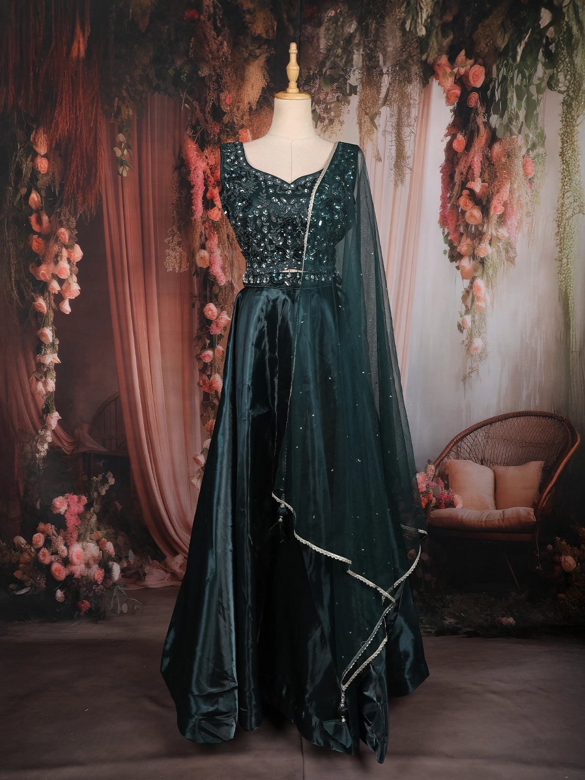 The lehenga skirt is crafted from lustrous tissue fabric, offering a soft sheen and fluid drape that moves effortlessly with every step. Its voluminous flare adds a regal charm, while the subtle scattered sparkle elevates the overall appeal without overpowering the design. Complementing the ensemble is a matching net dupatta, finished with a delicate border and light embellishments, perfectly balancing sophistication and modern elegance.
