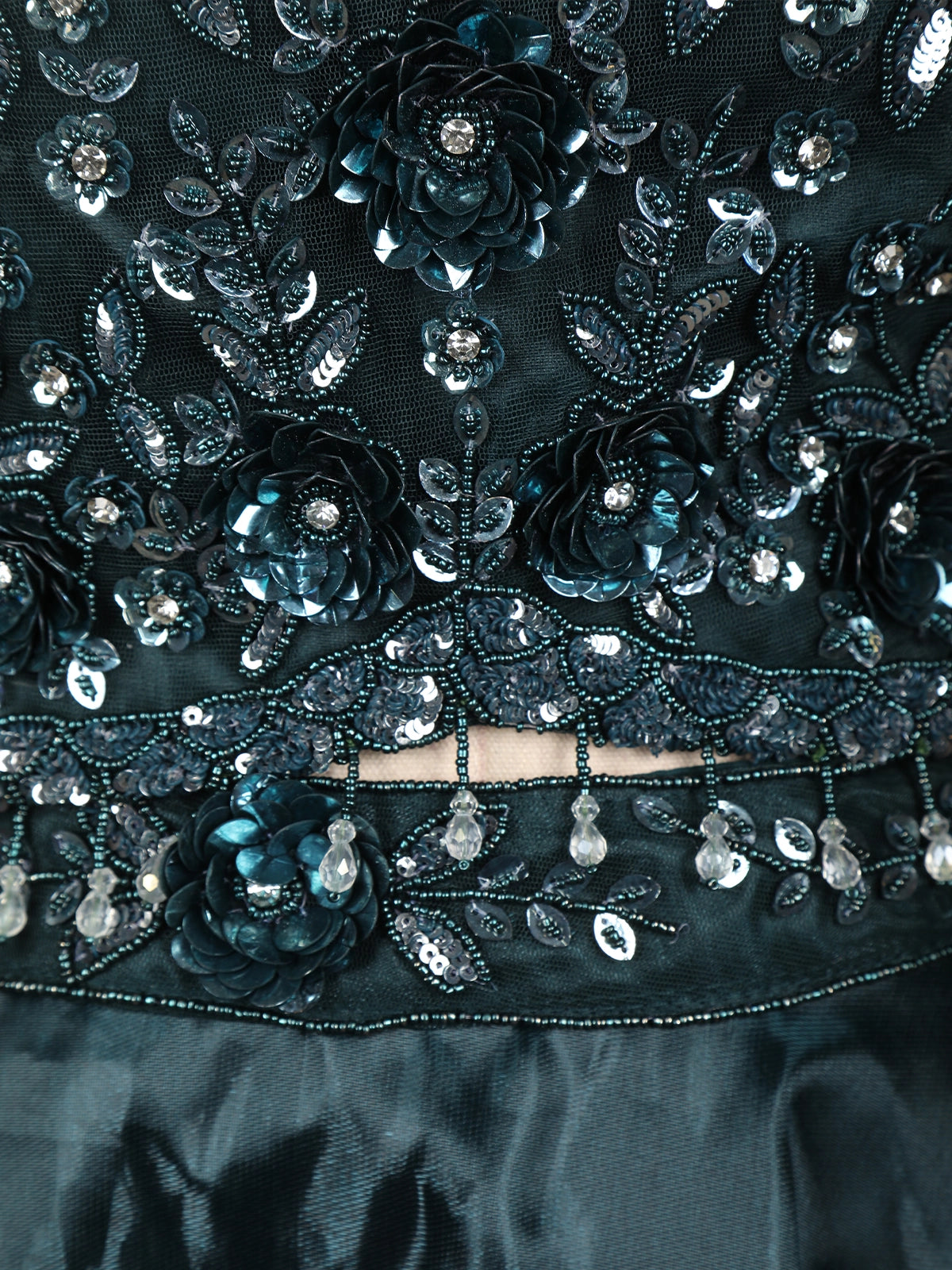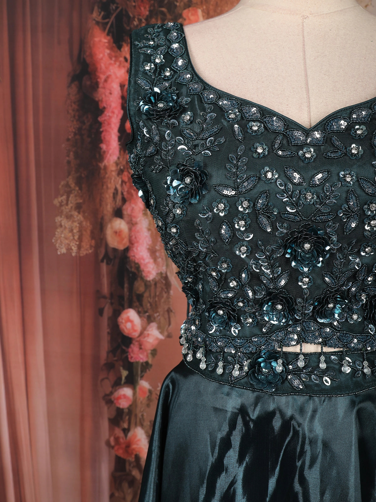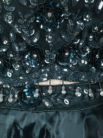 Make a lasting impression at weddings and grand celebrations with this exquisite peacock blue tissue bridesmaid lehenga, designed to radiate elegance and refined glamour. The blouse is beautifully adorned with intricate floral embroidery, highlighted by shimmering sequins, delicate beadwork, and subtle 3D floral accents that add depth and luxurious texture. The rich peacock blue tone enhances the embellishments, creating a striking yet graceful look.